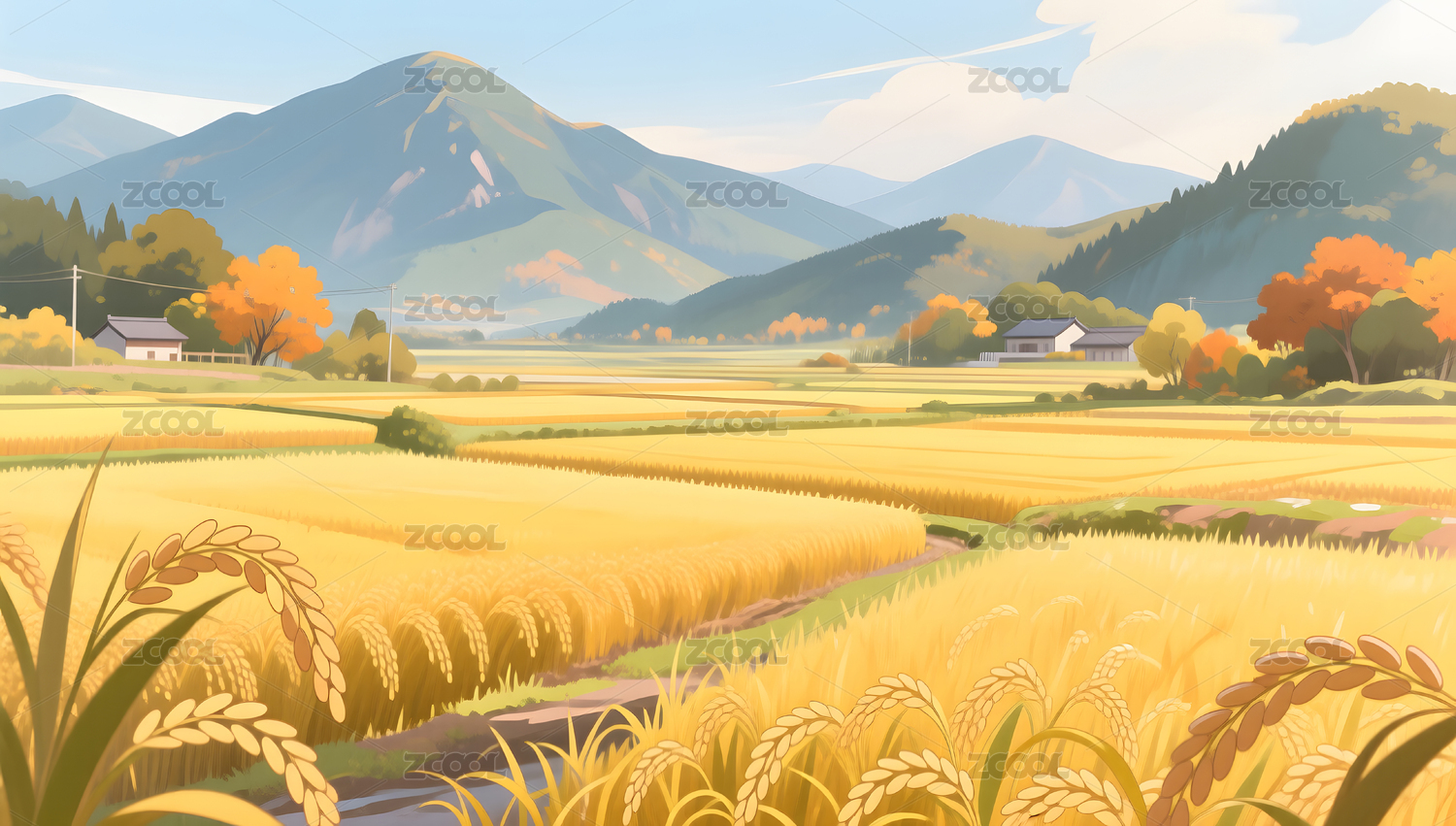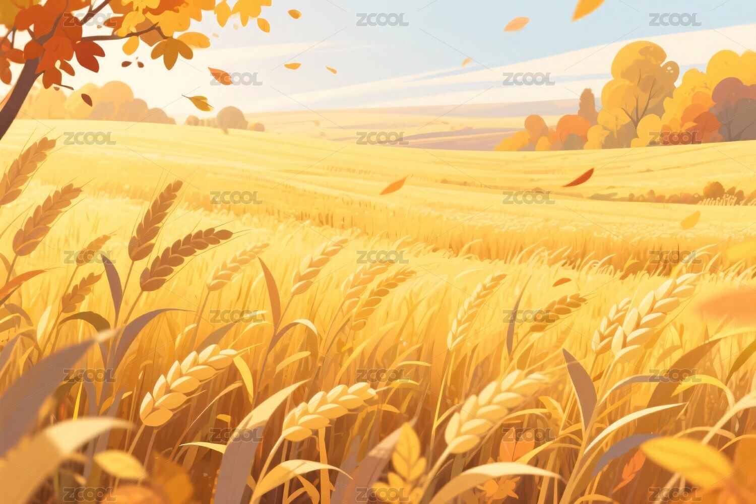 秋日金黄麦田插画风景