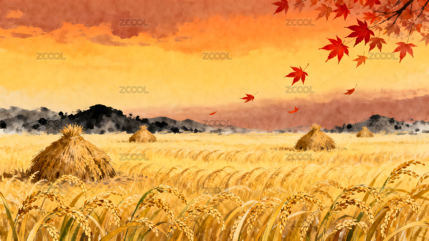 金秋稻田与红叶晚霞