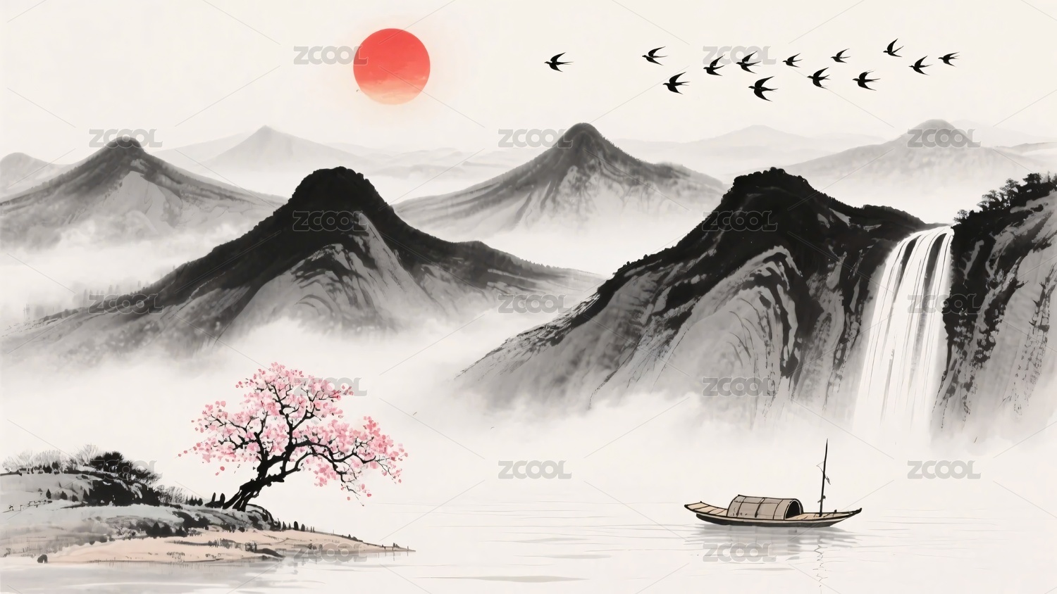 禅意山水画 意境山水花鸟画 水墨花鸟画水墨江南山水画