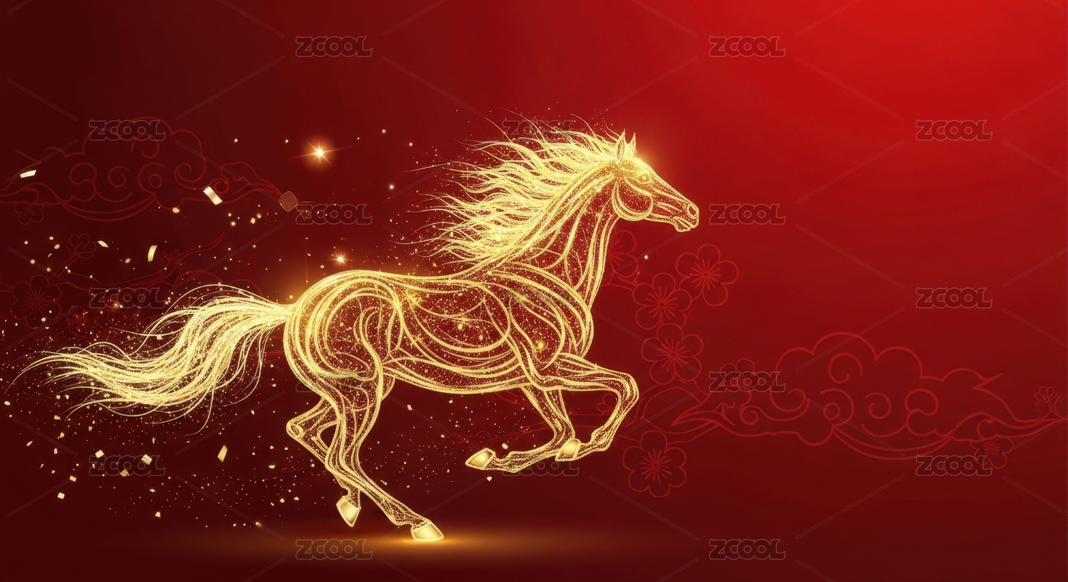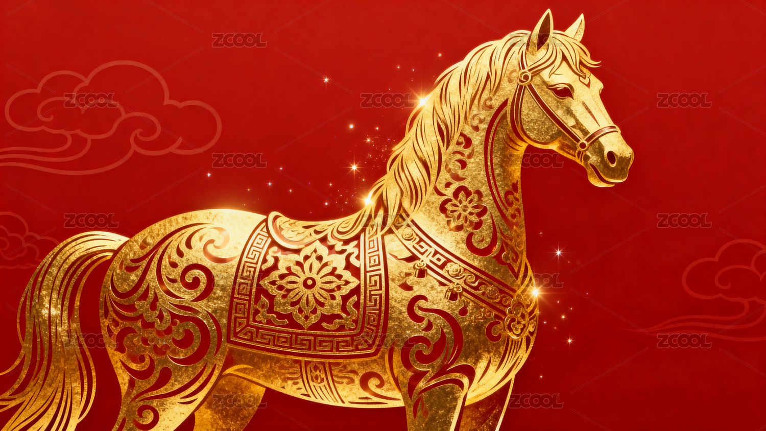 金色骏马奔腾于红底祥云间