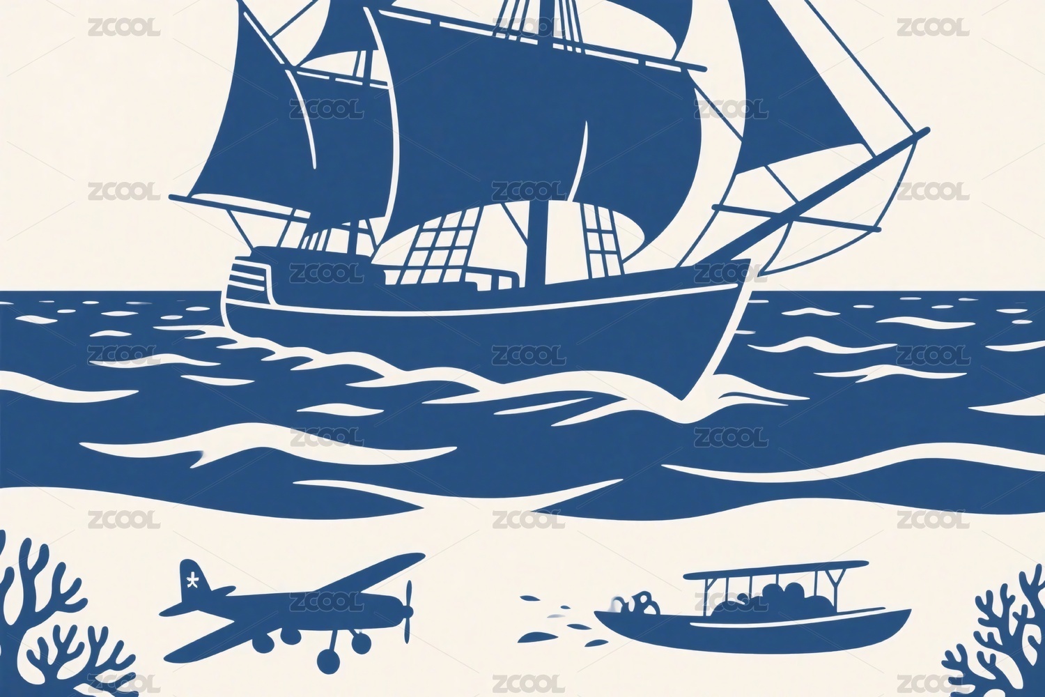 海洋中的船只与飞机插画