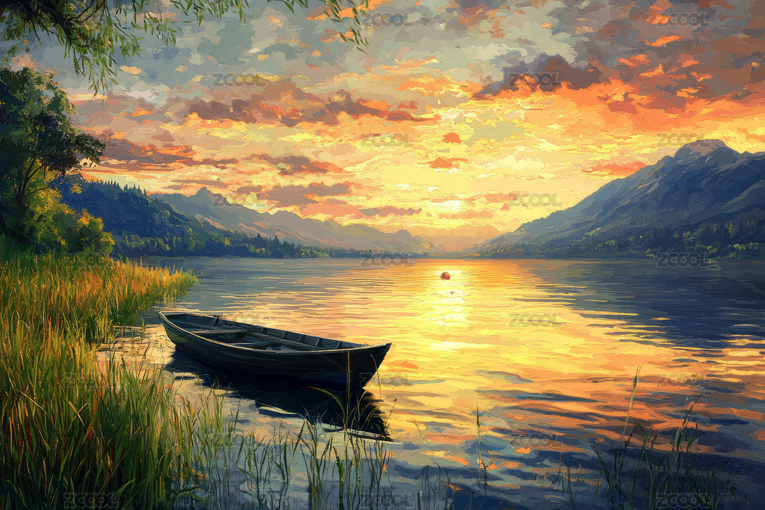 湖畔小船黄昏景