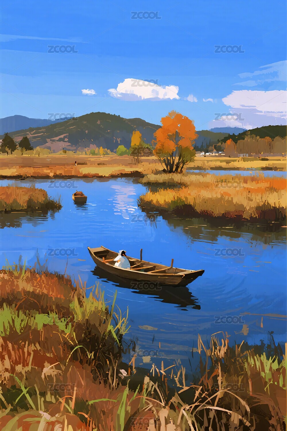 秋日河上小船风景图