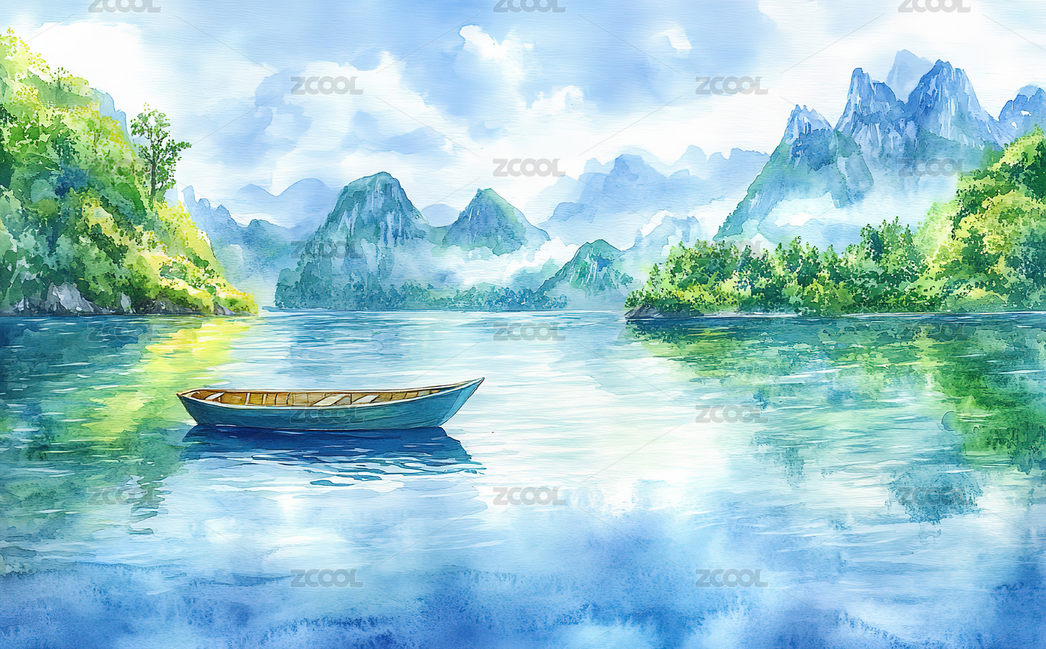 红船,湖水,树木,远山,天空,插画,自然风景,宁静,唯美,蓝色