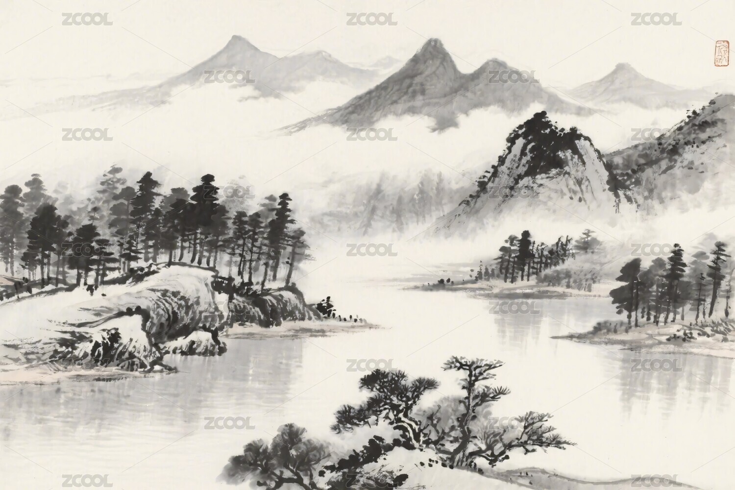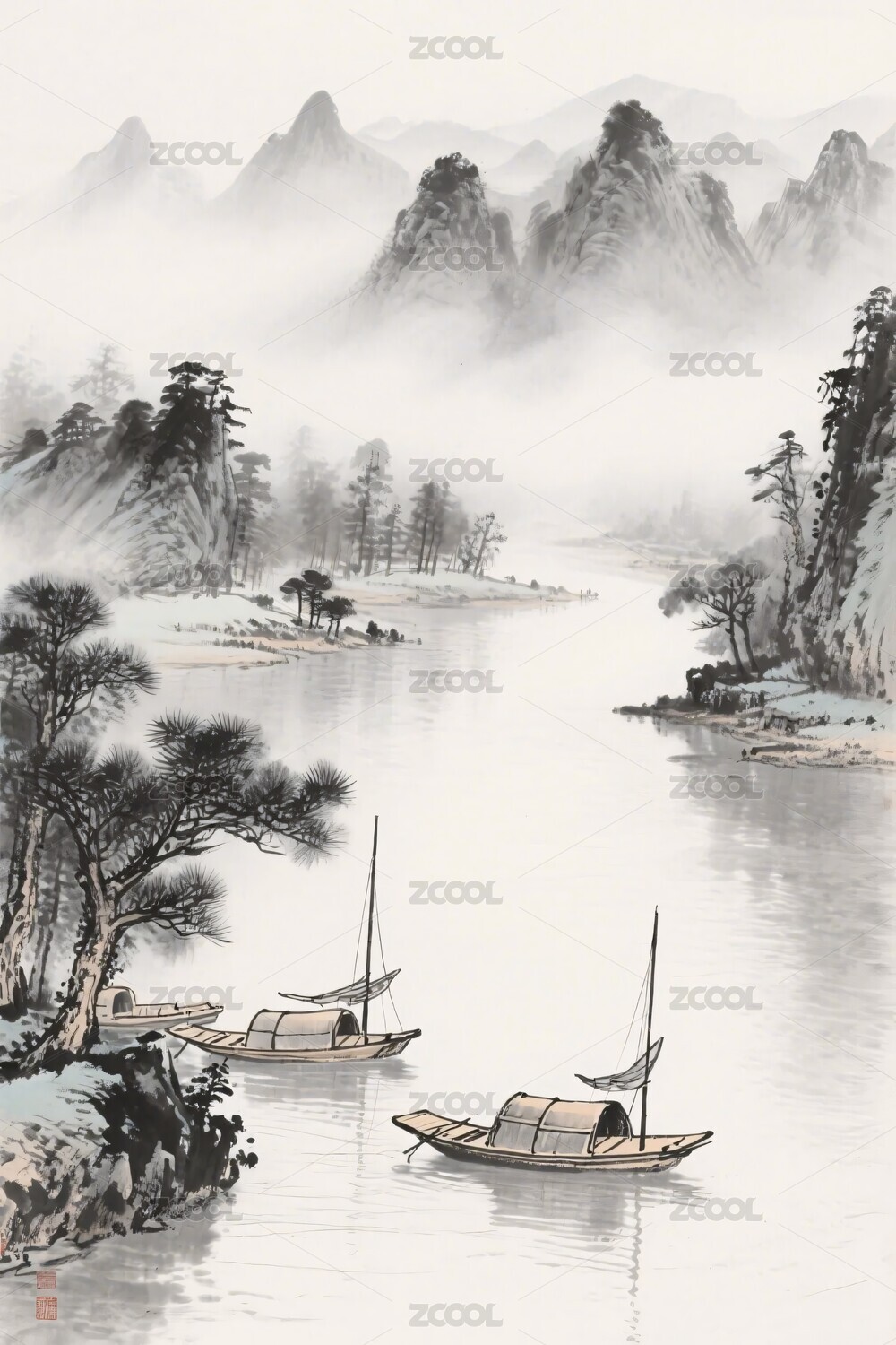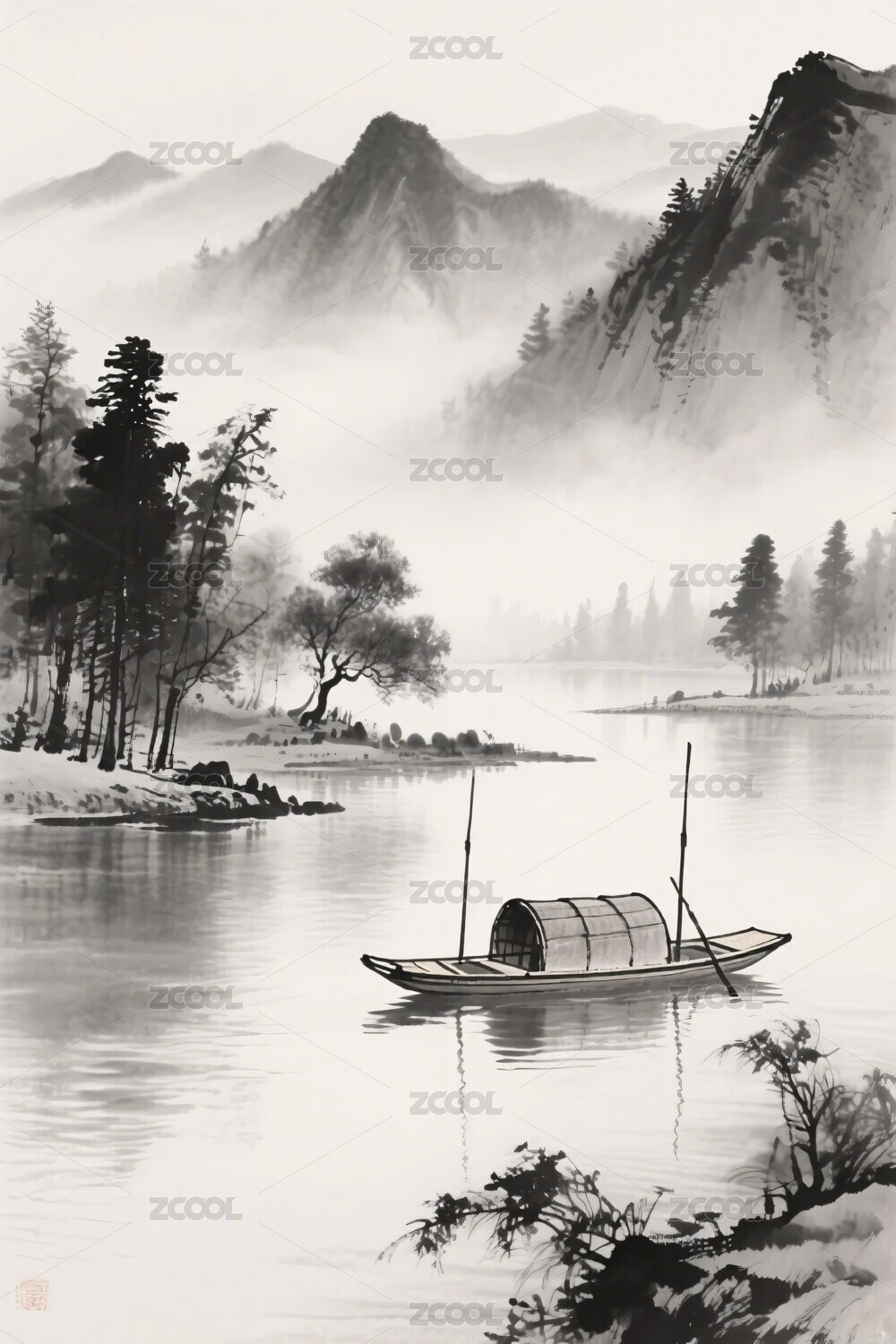 山水,孤舟,树木,云雾,水墨画,插画,中式,自然,宁静,淡雅