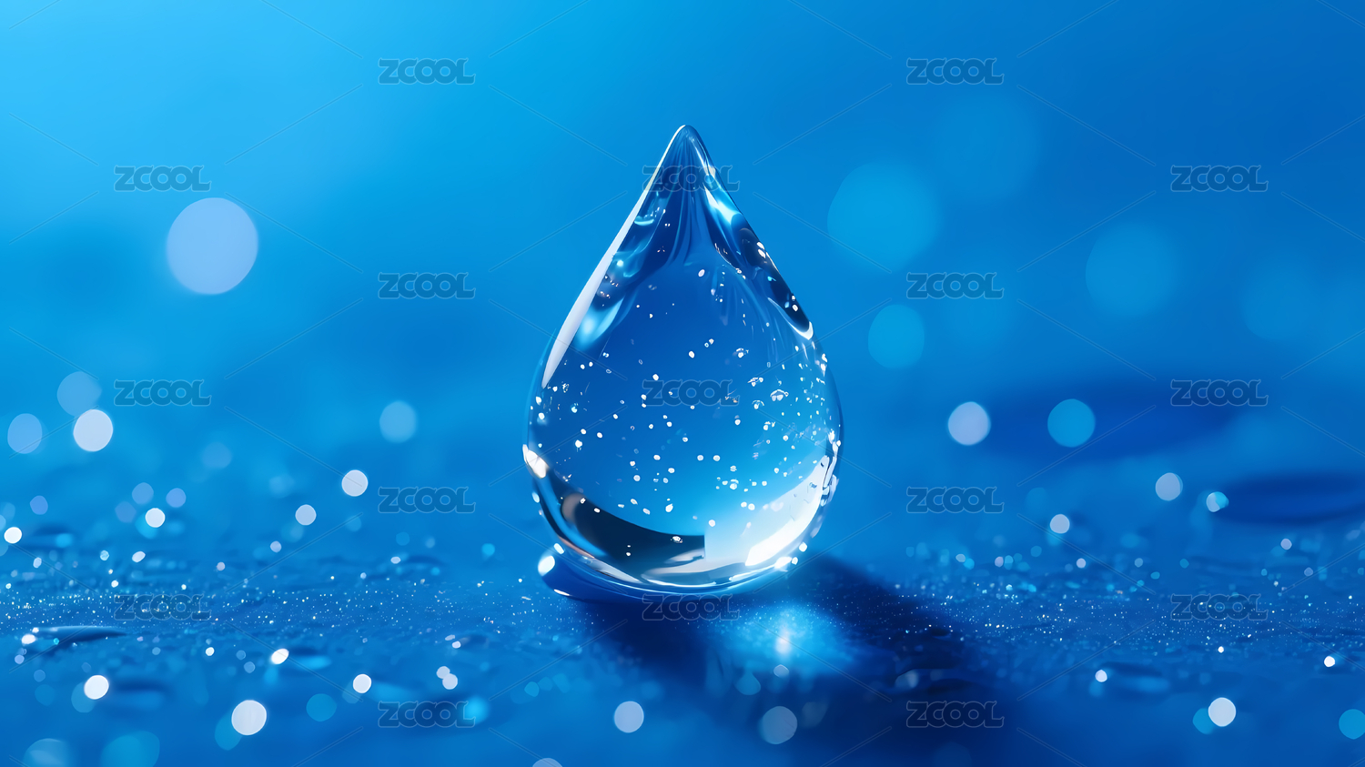 清澈蓝色水滴与蓝色光斑的纯净氛围