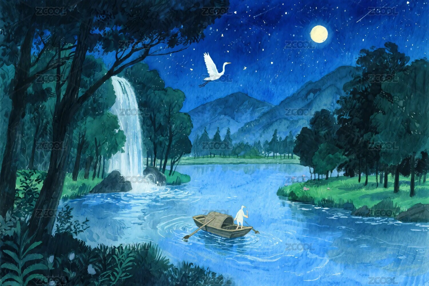 夜晚,星空,湖水,小船,白鹭,瀑布,森林,插画,自然,风景