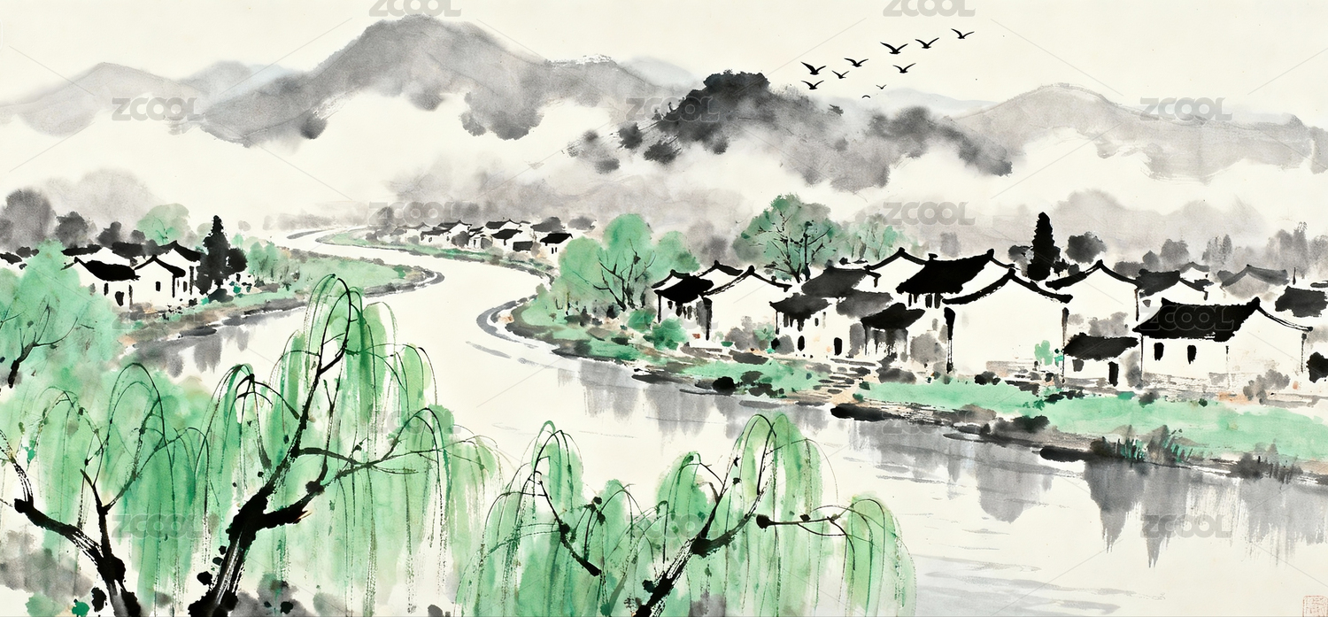 水墨画,江南,水乡,船只,房屋,山水,风景,传统,中式,古风
