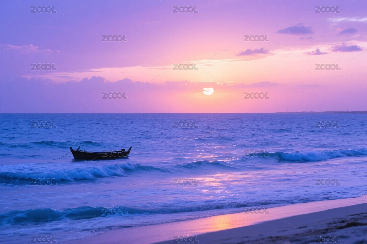 沙滩,大海,孤舟,海浪,建筑,植物,黄昏,自然风景,美景,插画