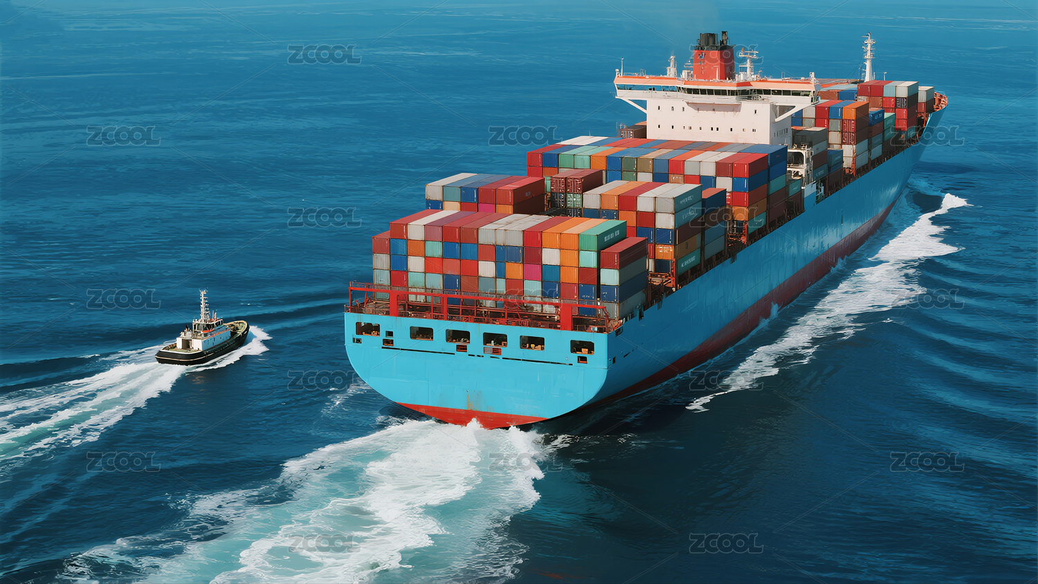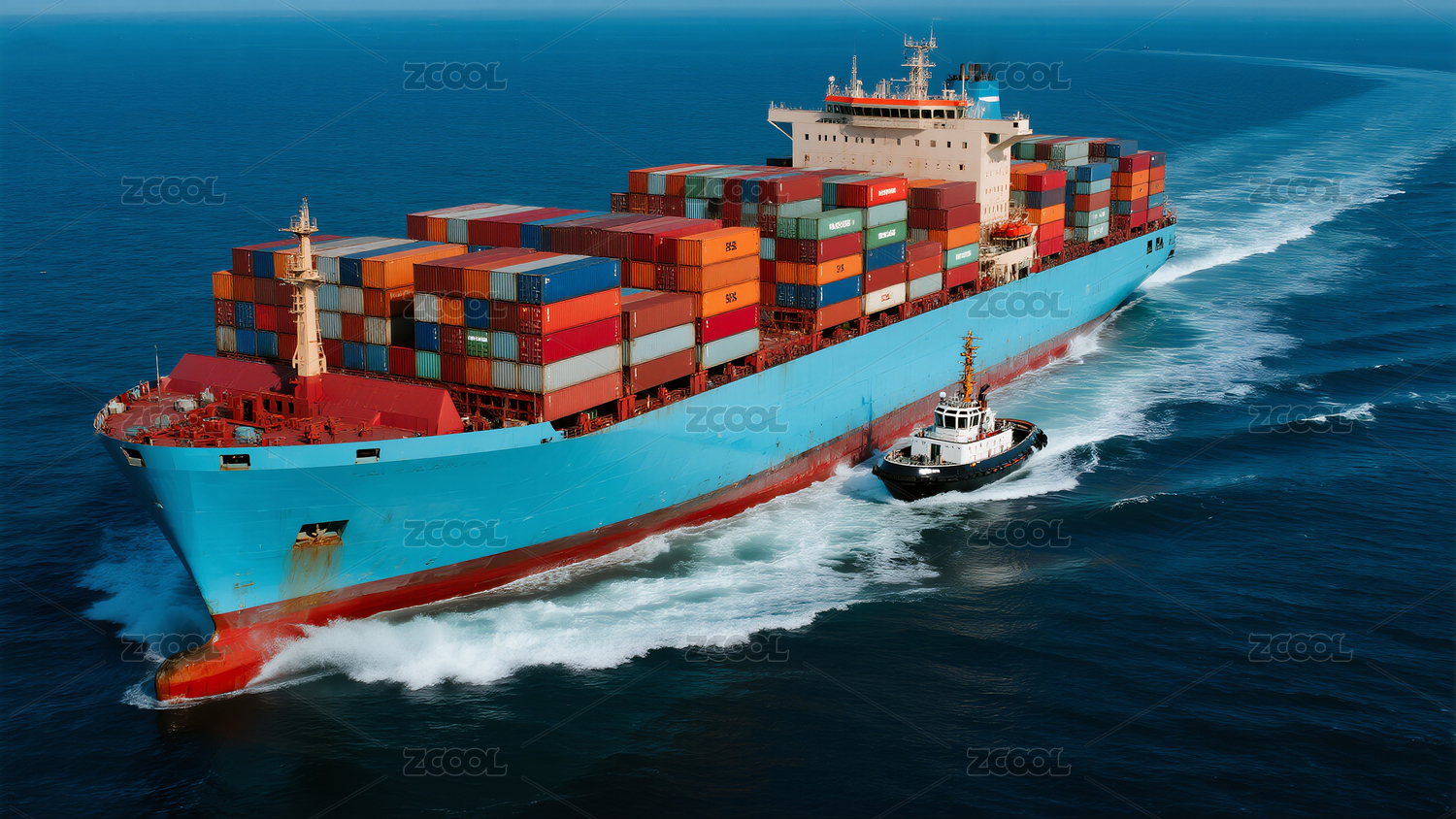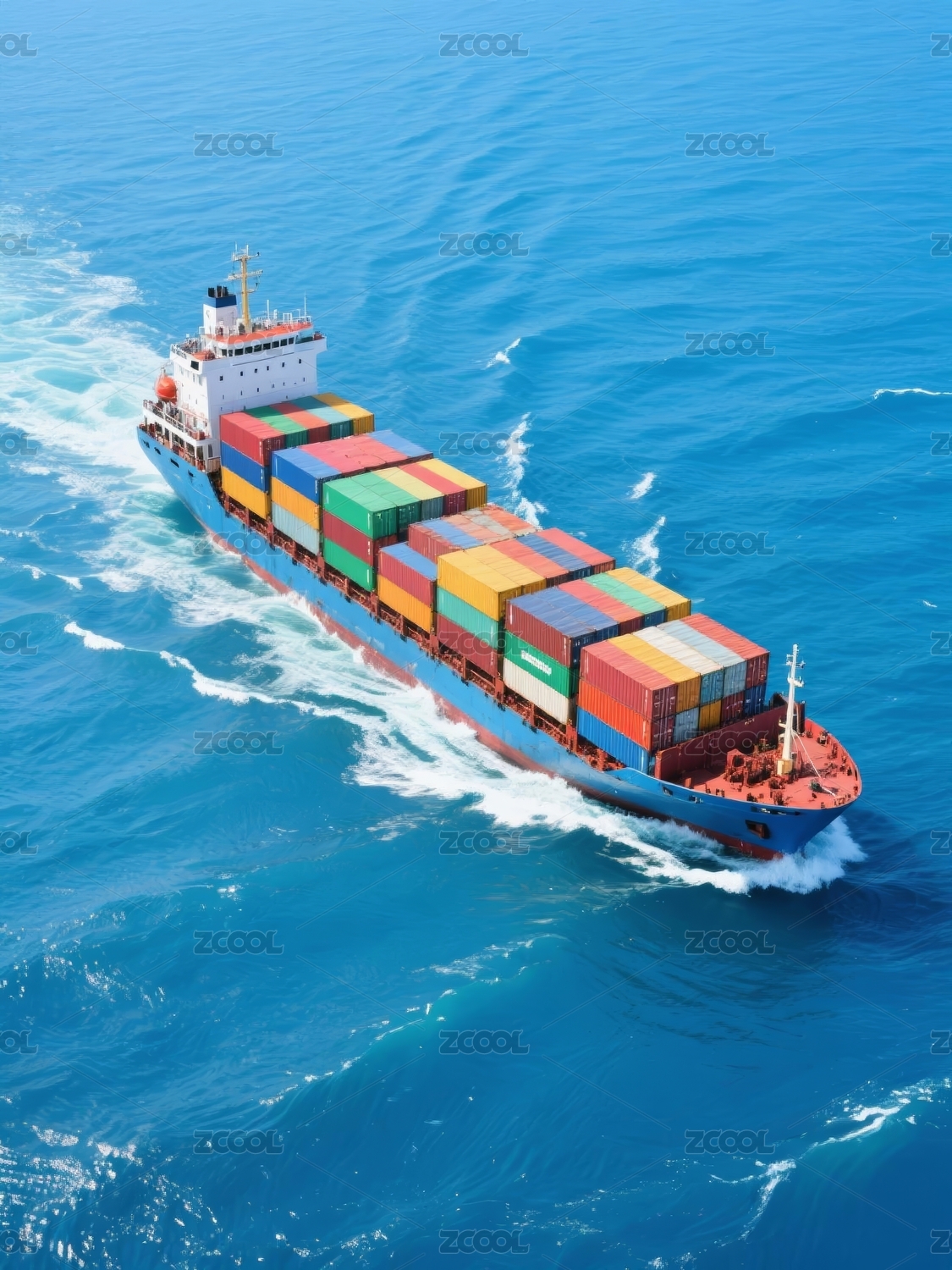 满载彩色集装箱货轮航行于蔚蓝海洋