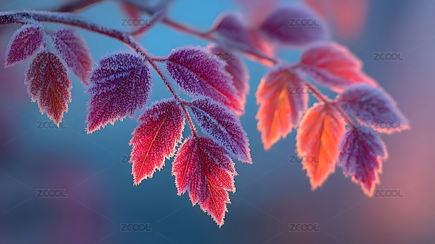 霜叶,枯叶,冬日,树枝,冰霜,清晨,光影,唯美,自然,静谧