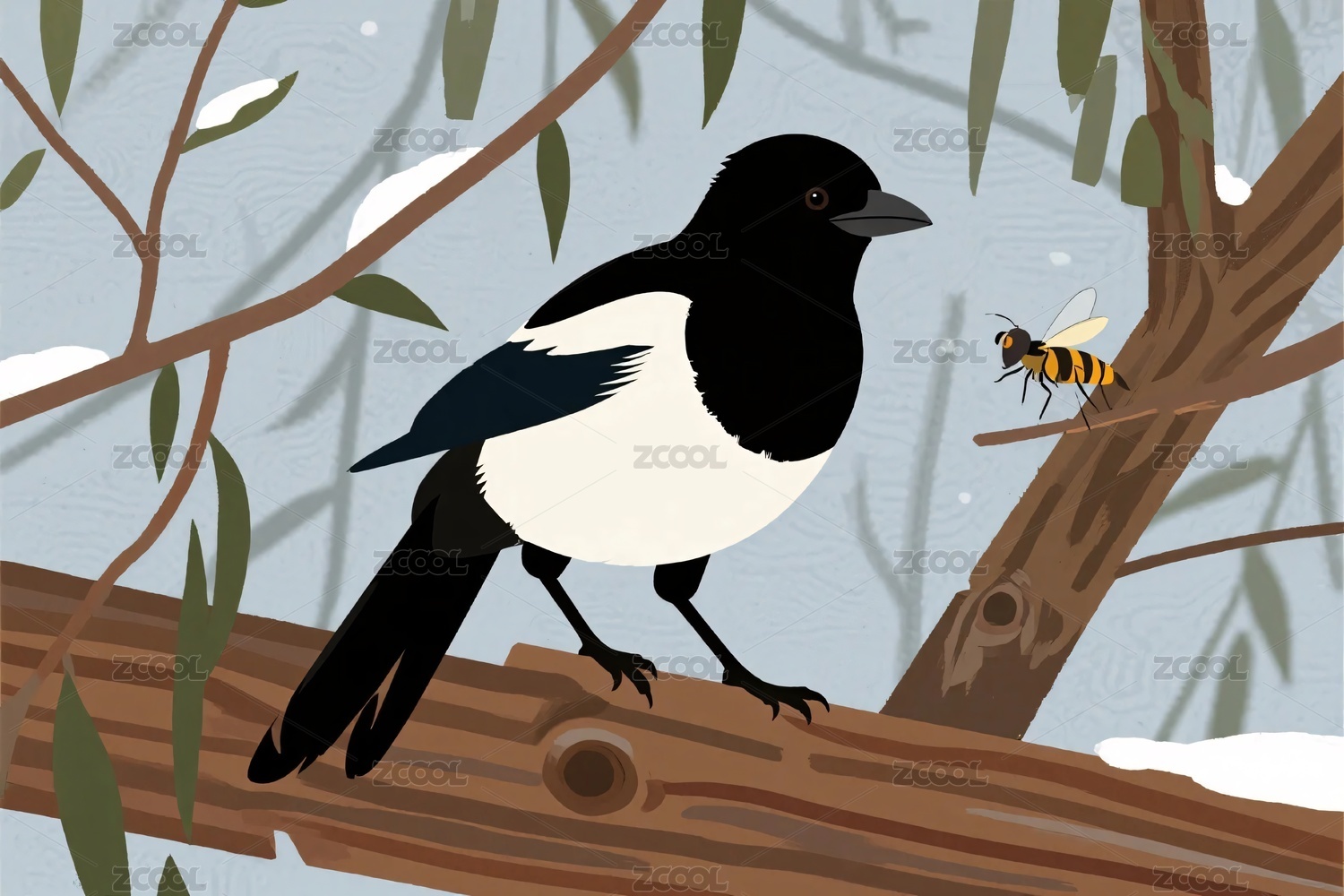 喜鹊栖息插画