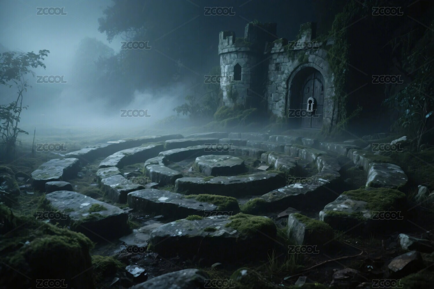 废墟,石圈,古堡,雾气,暗夜,遗迹,石刻,石块,森林,遗址