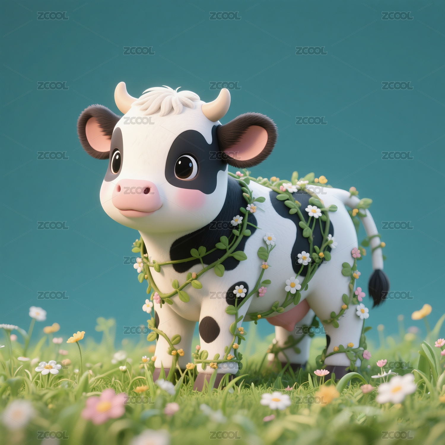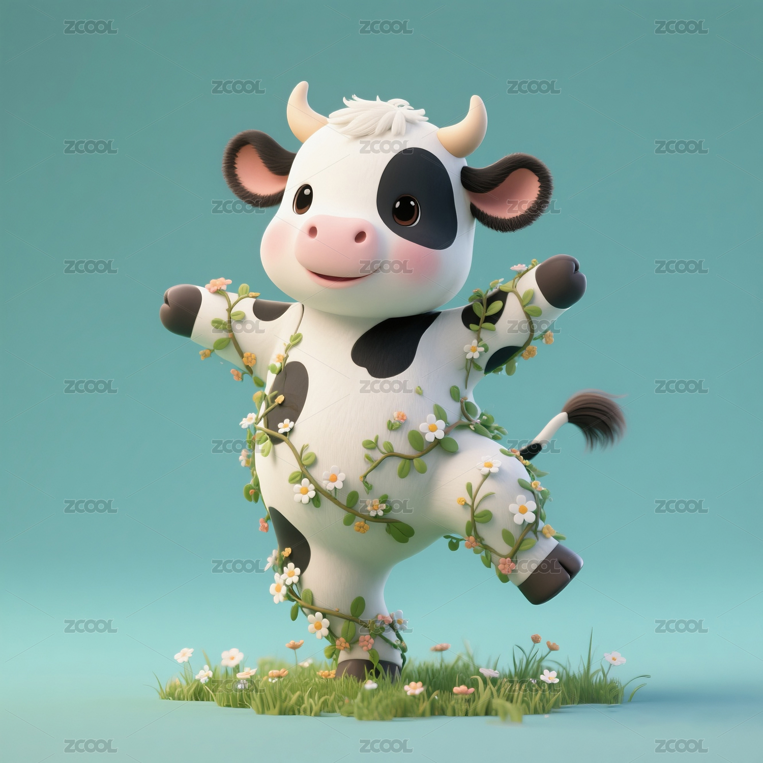 藤蔓缠绕的奶牛宝宝在草原上跳舞