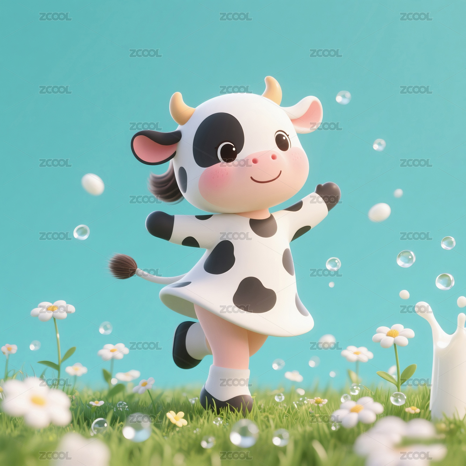 藤蔓缠绕的奶牛宝宝在草原上跳舞