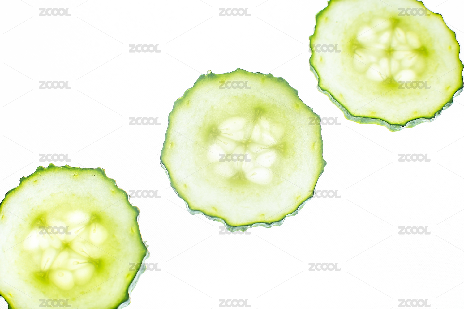 白背景黄瓜切片特写,夏日清凉护肤主题。