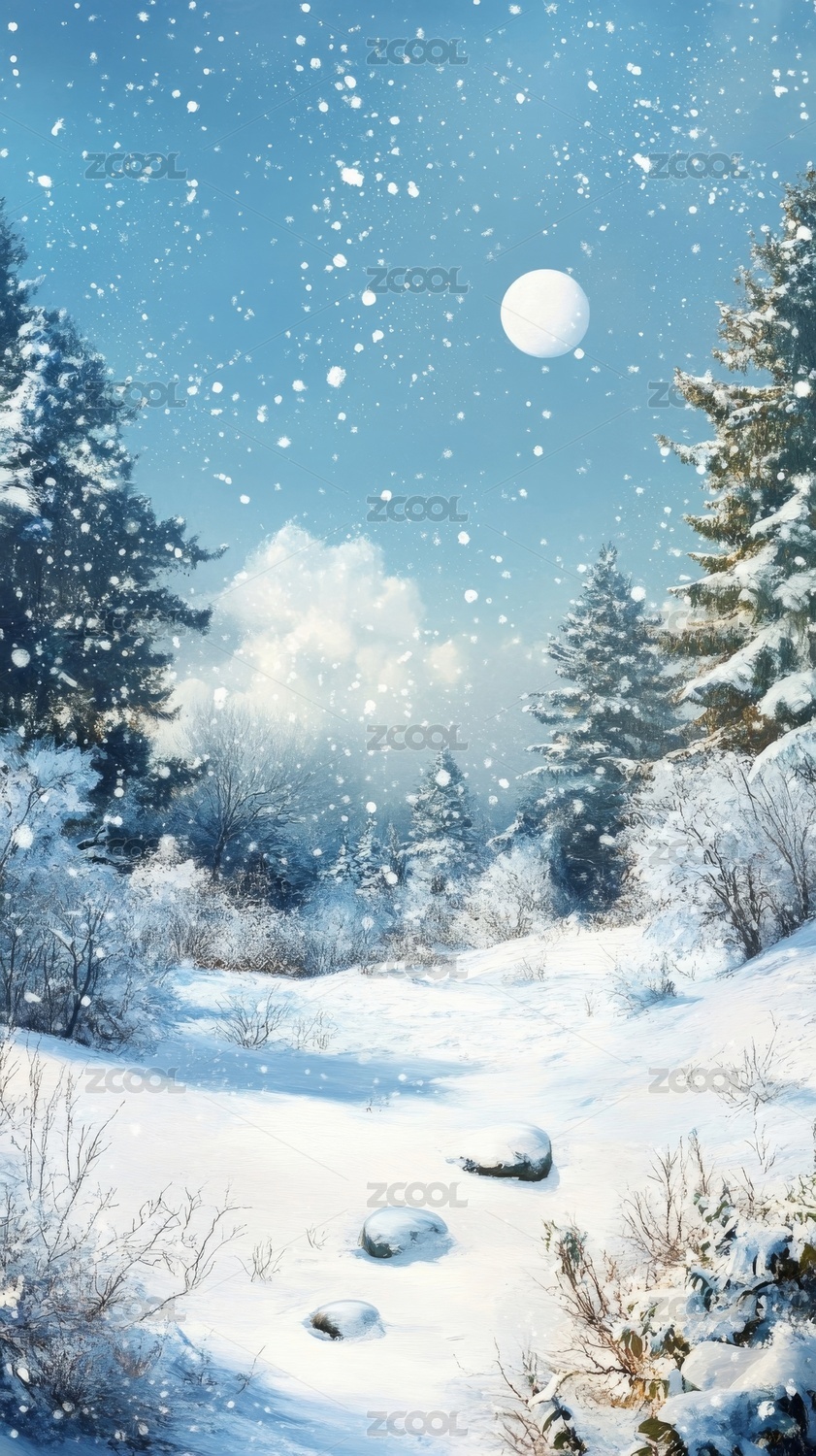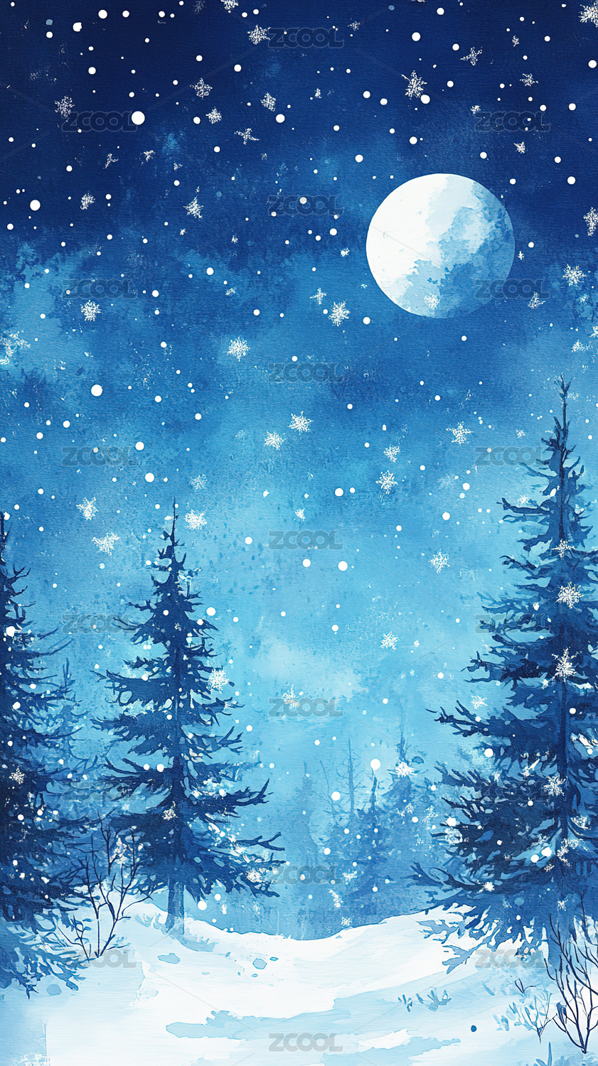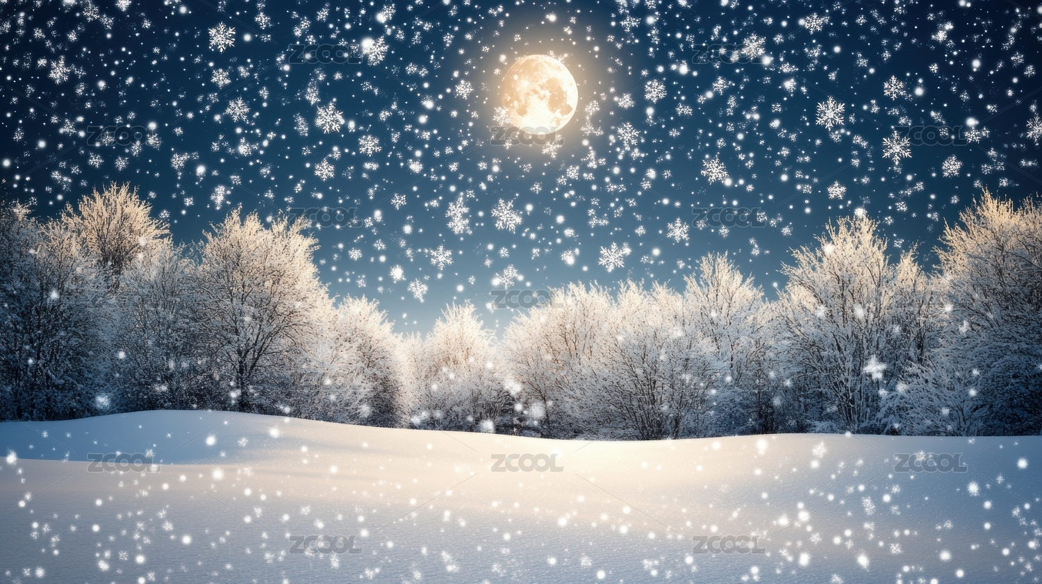 雪夜,满月,森林,雪景,夜晚,道路,树木,雪花,雪地,冬季