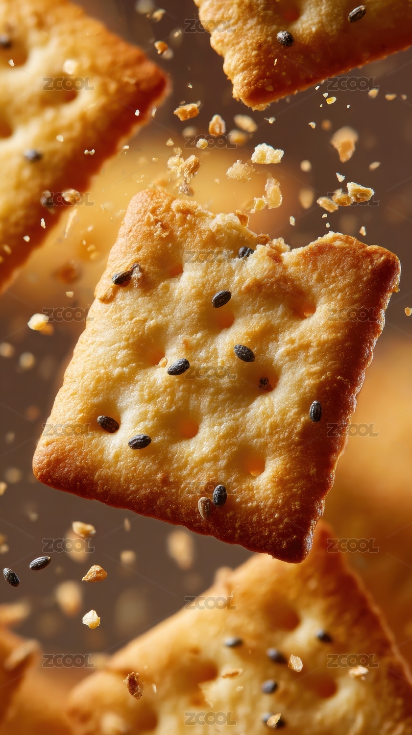 金黄脆海盐饼干漂浮在空中降落