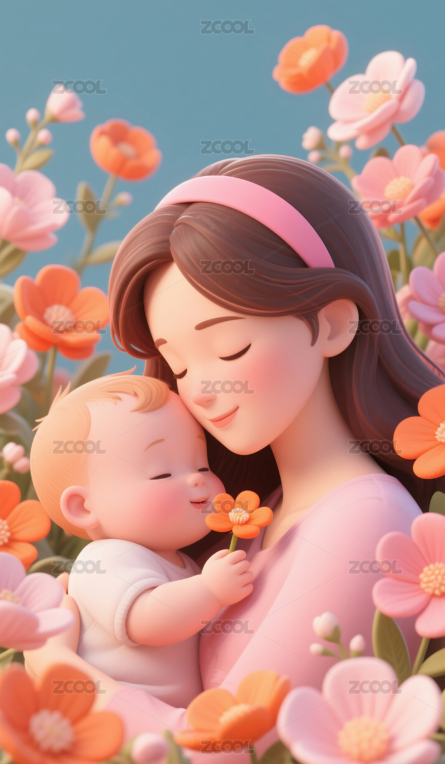 3D温馨花丛中的母婴插画背景壁纸