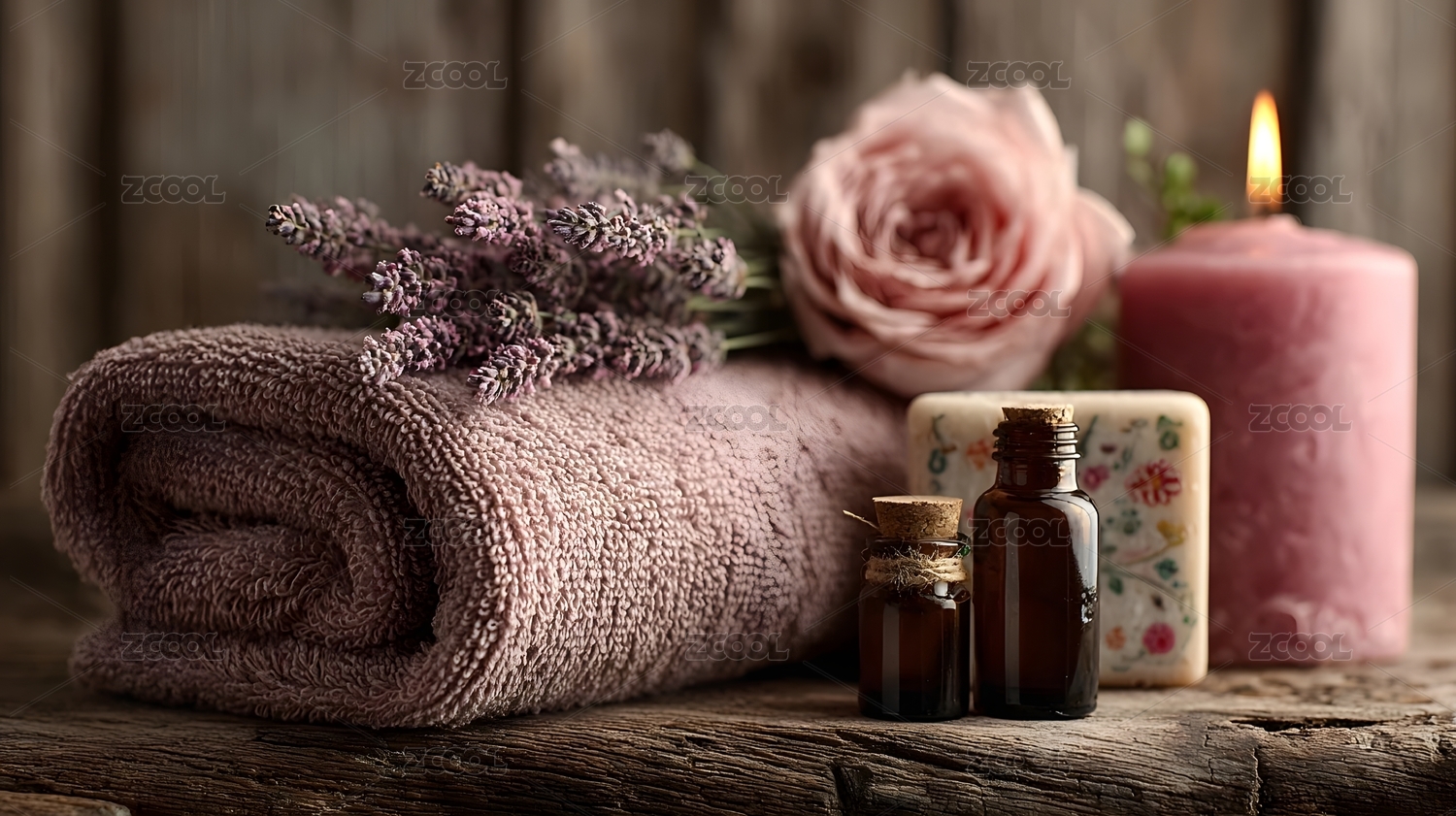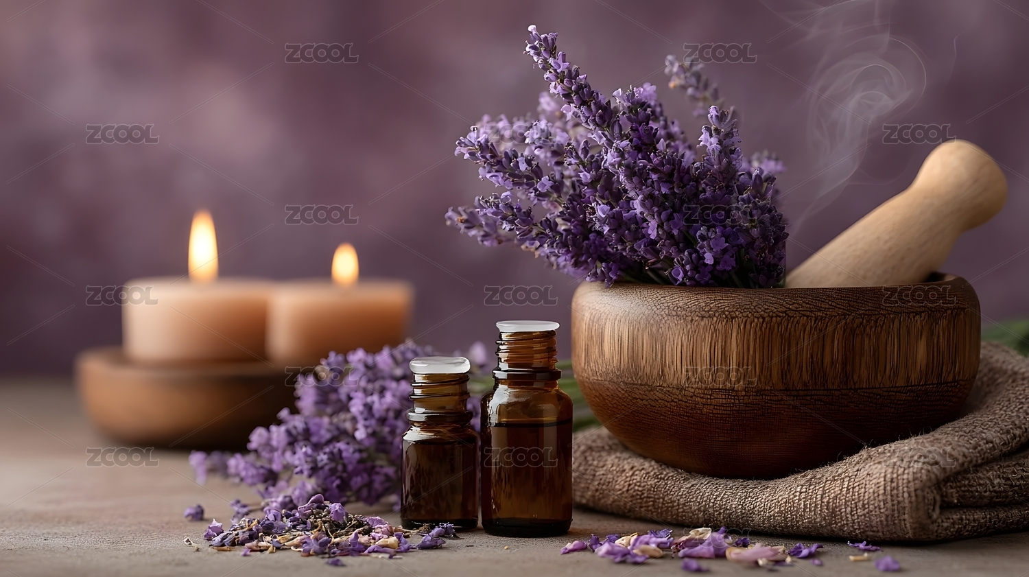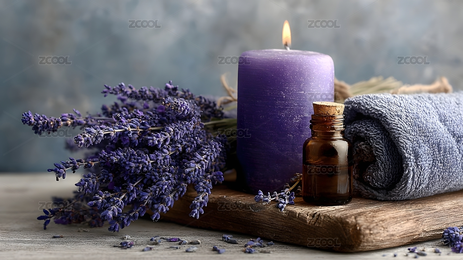 紫色香薰蜡烛搭配毛巾与薰衣草