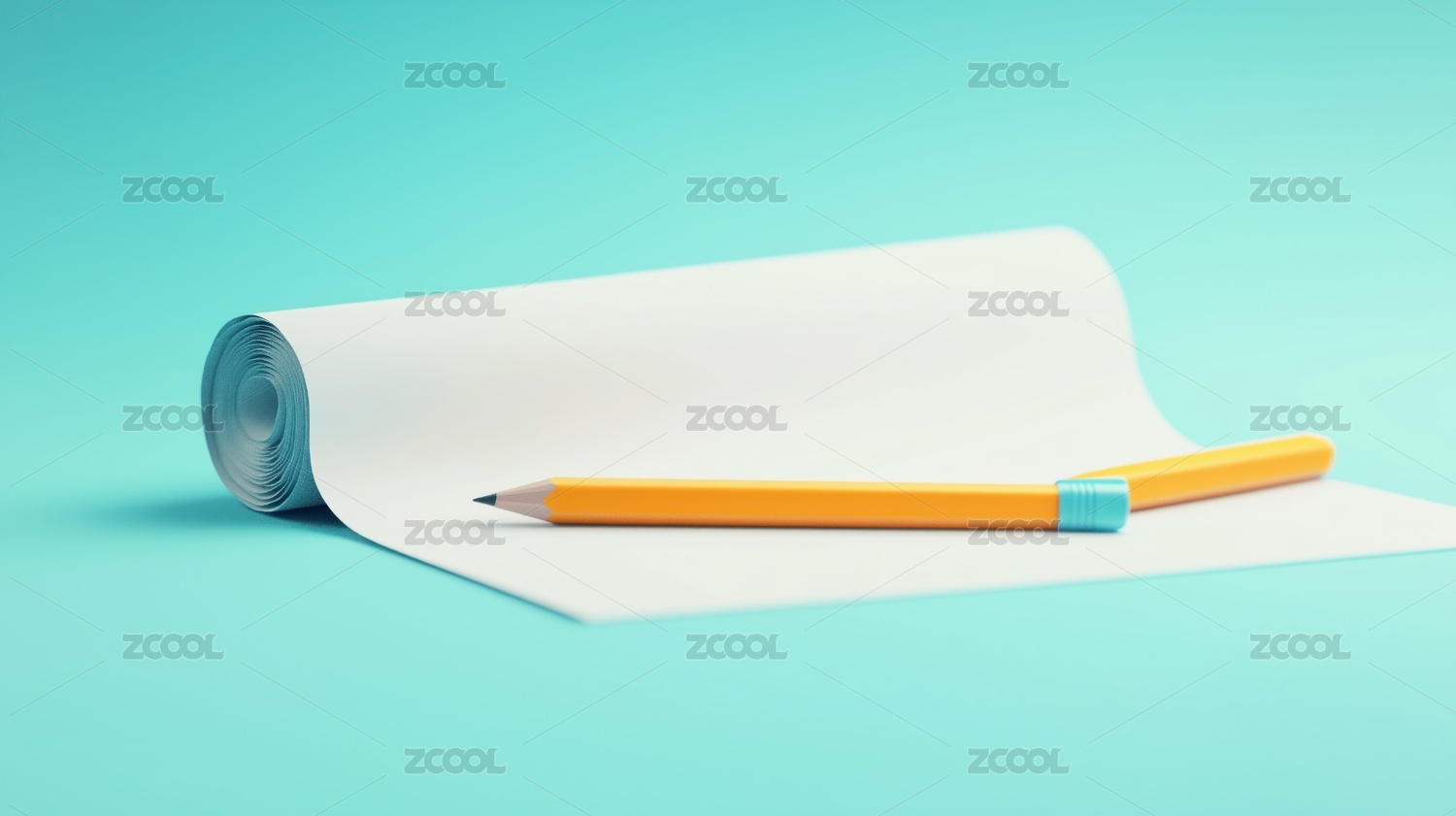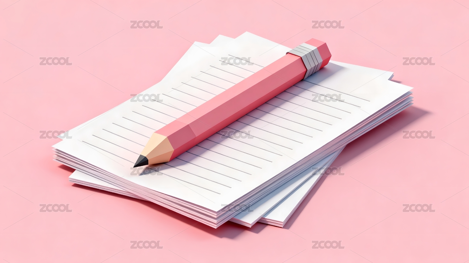 清新明亮纯色桌面上铅笔和纸3D立体插画