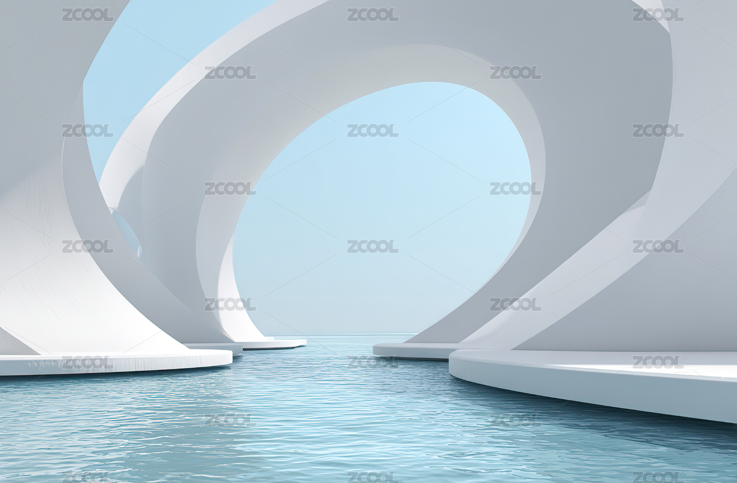白色曲线建筑与蓝天水面