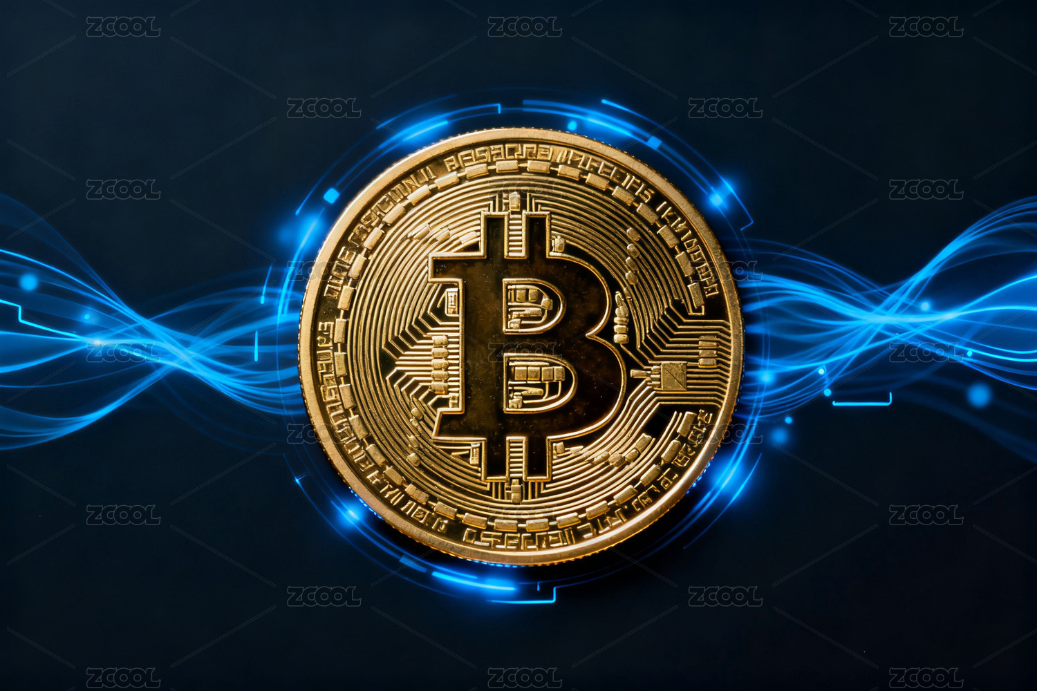 金色比特币与蓝色光效