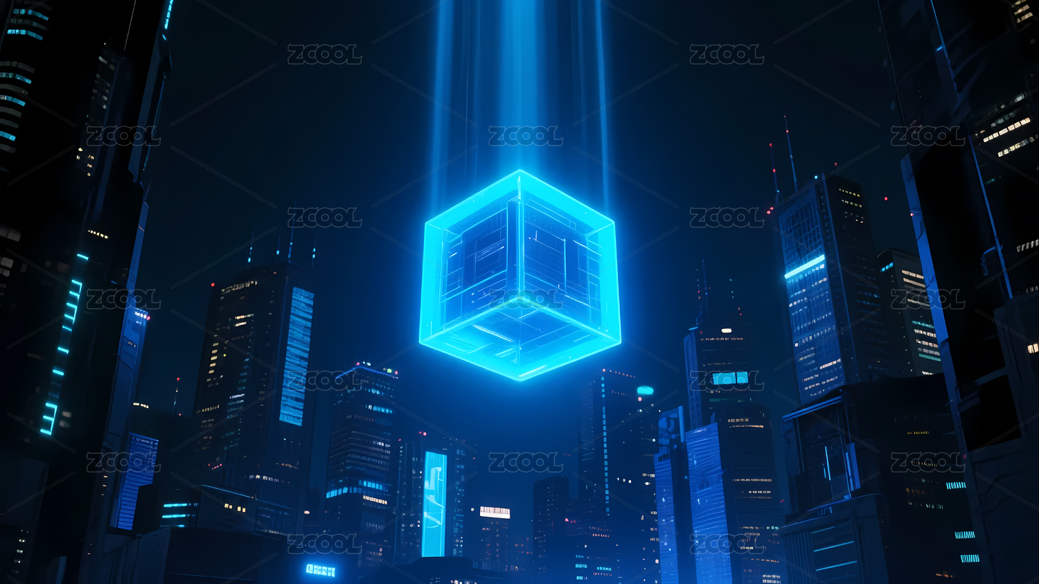 未来科技风城市高楼背景下的发光能量魔方