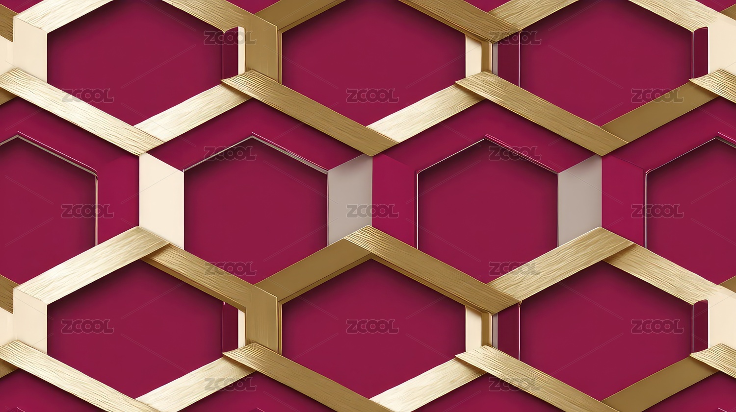 红色蜂窝状几何图案带有金色边框的抽象背景