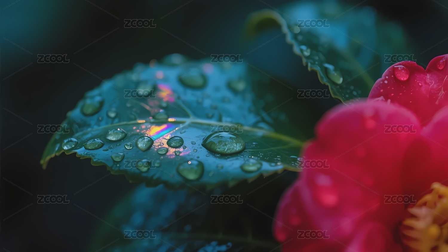 雨滴点缀的绿叶与红花