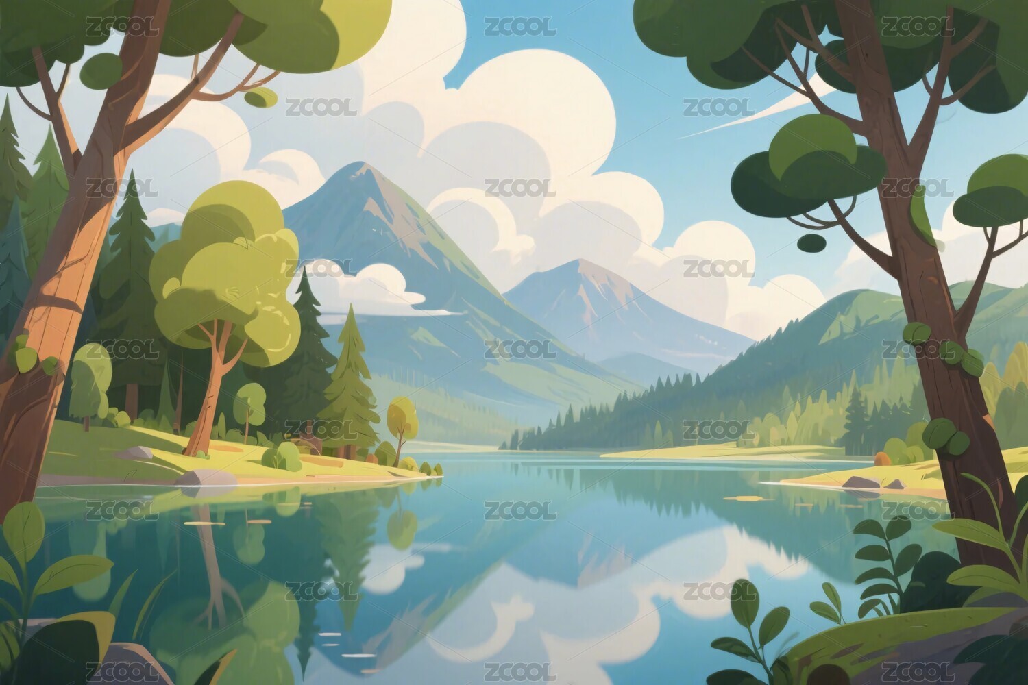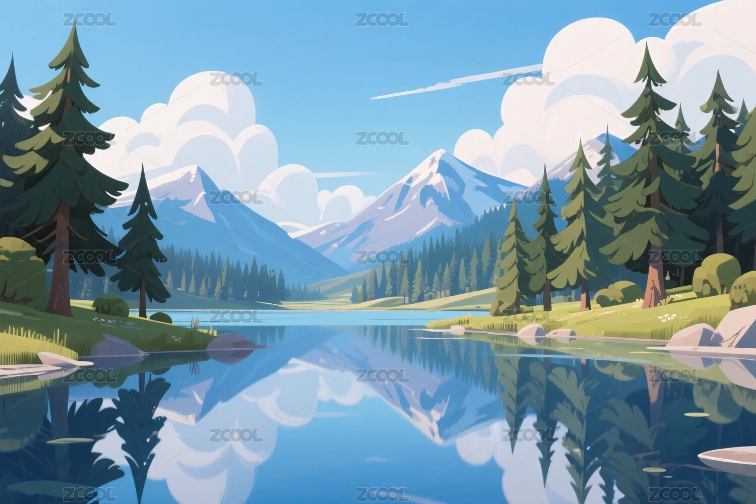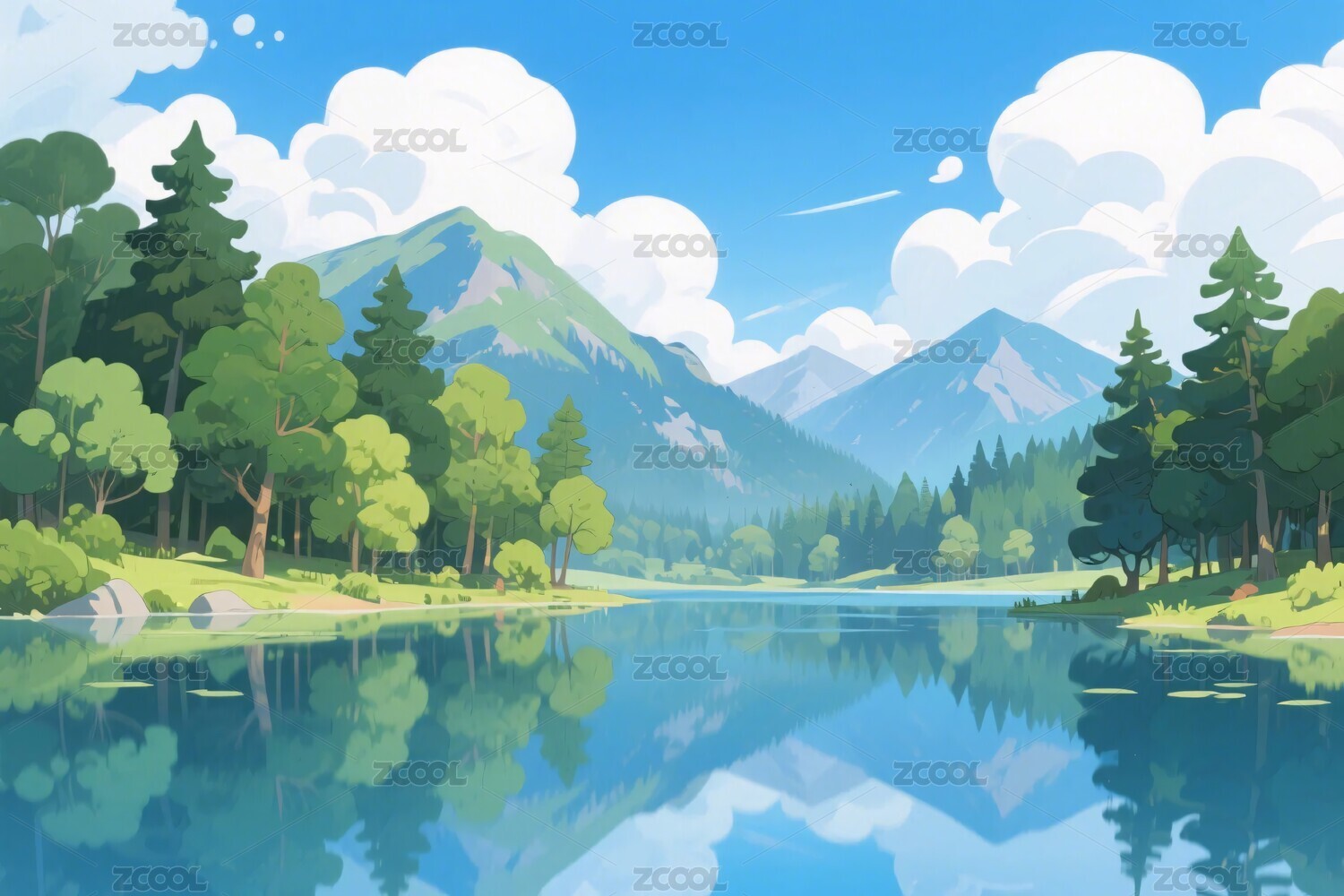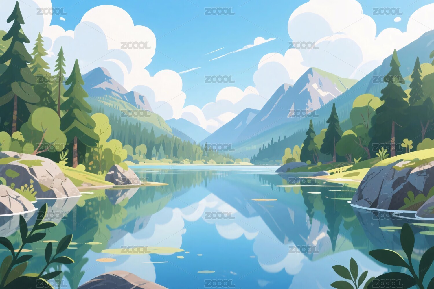 湖泊,小船,山林,树木,天空,水面,荷花,风景,插画,矢量