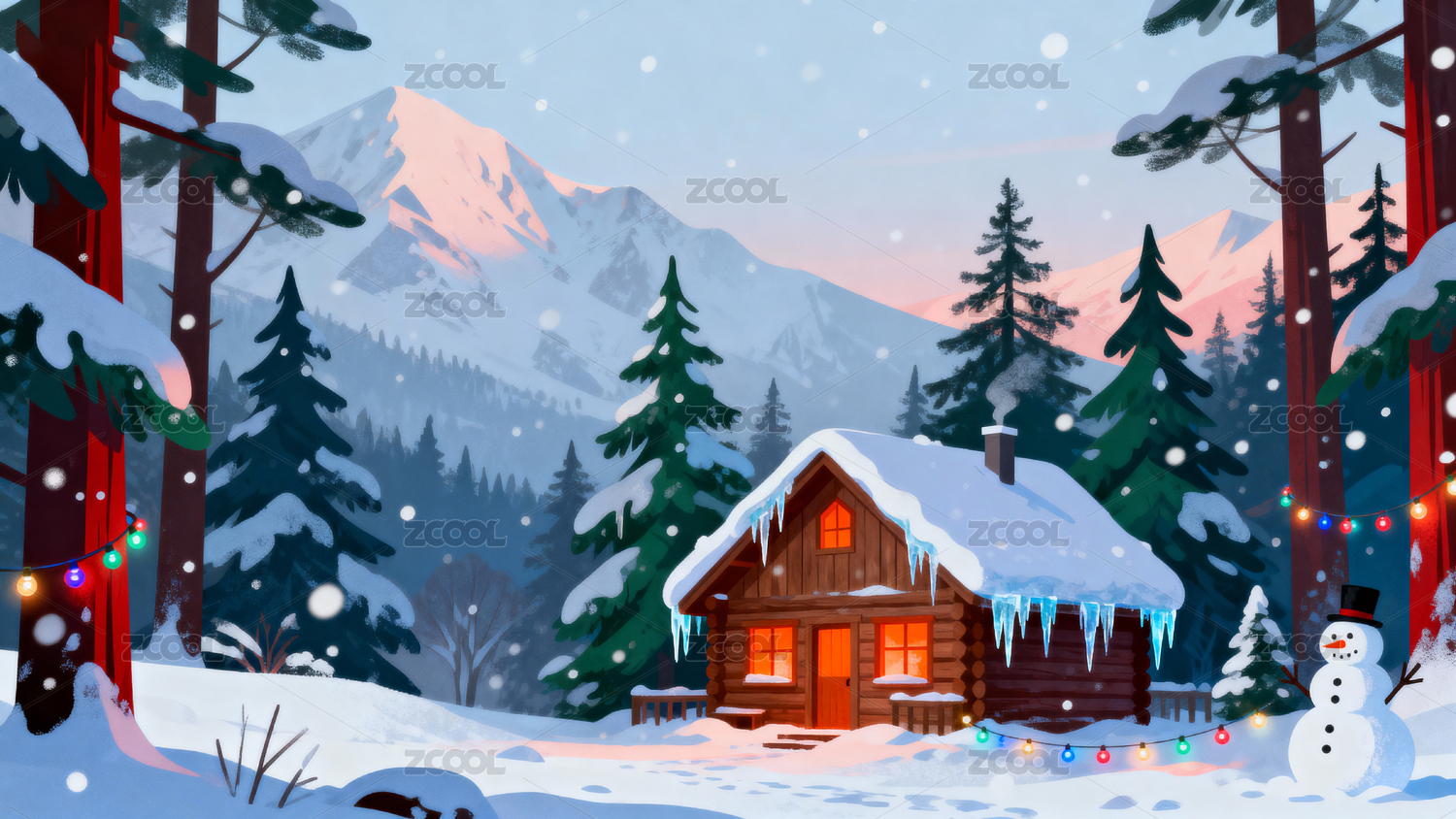 雪景,木屋,树木,雪地,山林,房屋,冬季,风景,雪村,插画
