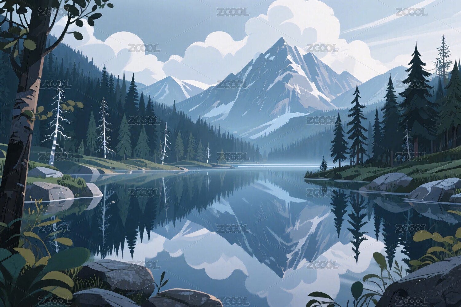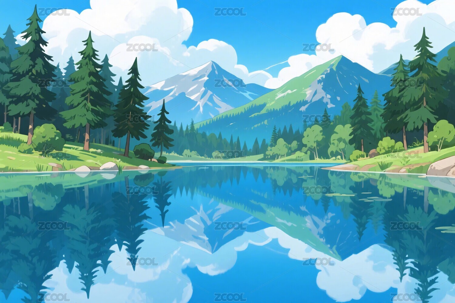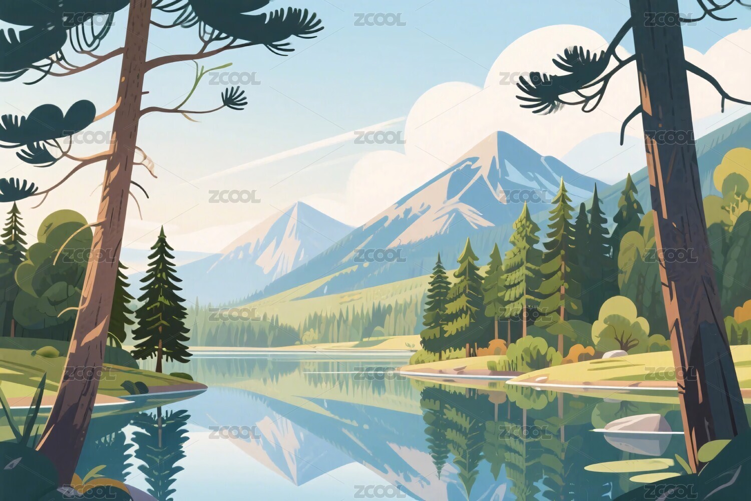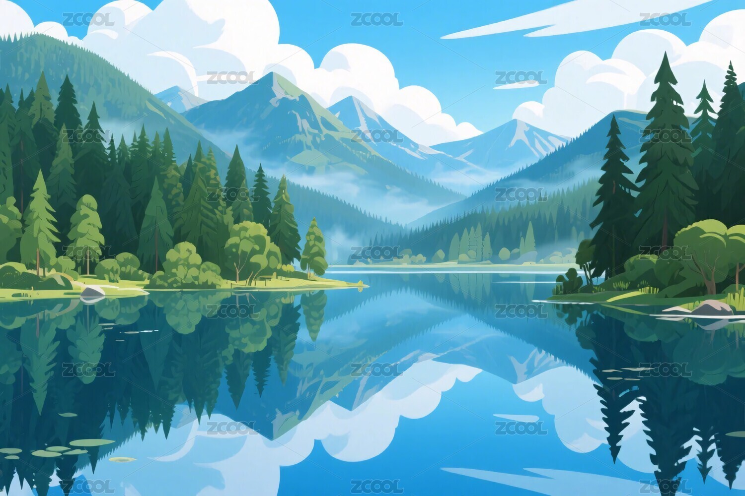 山水,森林,湖泊,山脉,蓝天,树木,风景,自然,插画,矢量