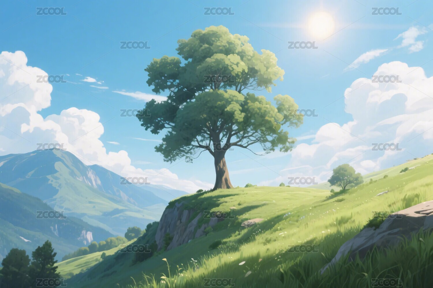 草地大树风景插画