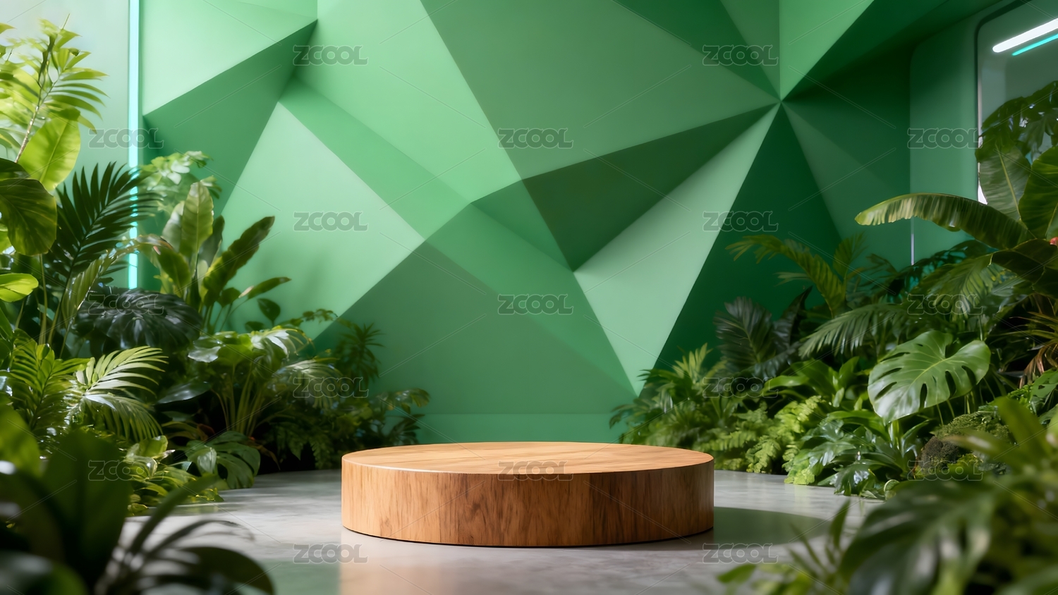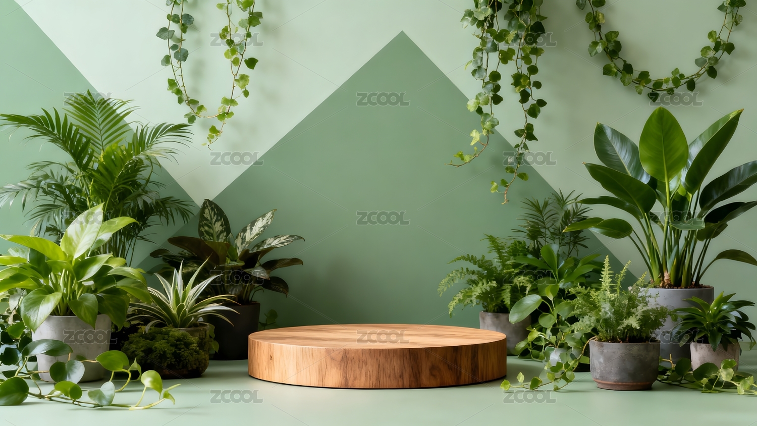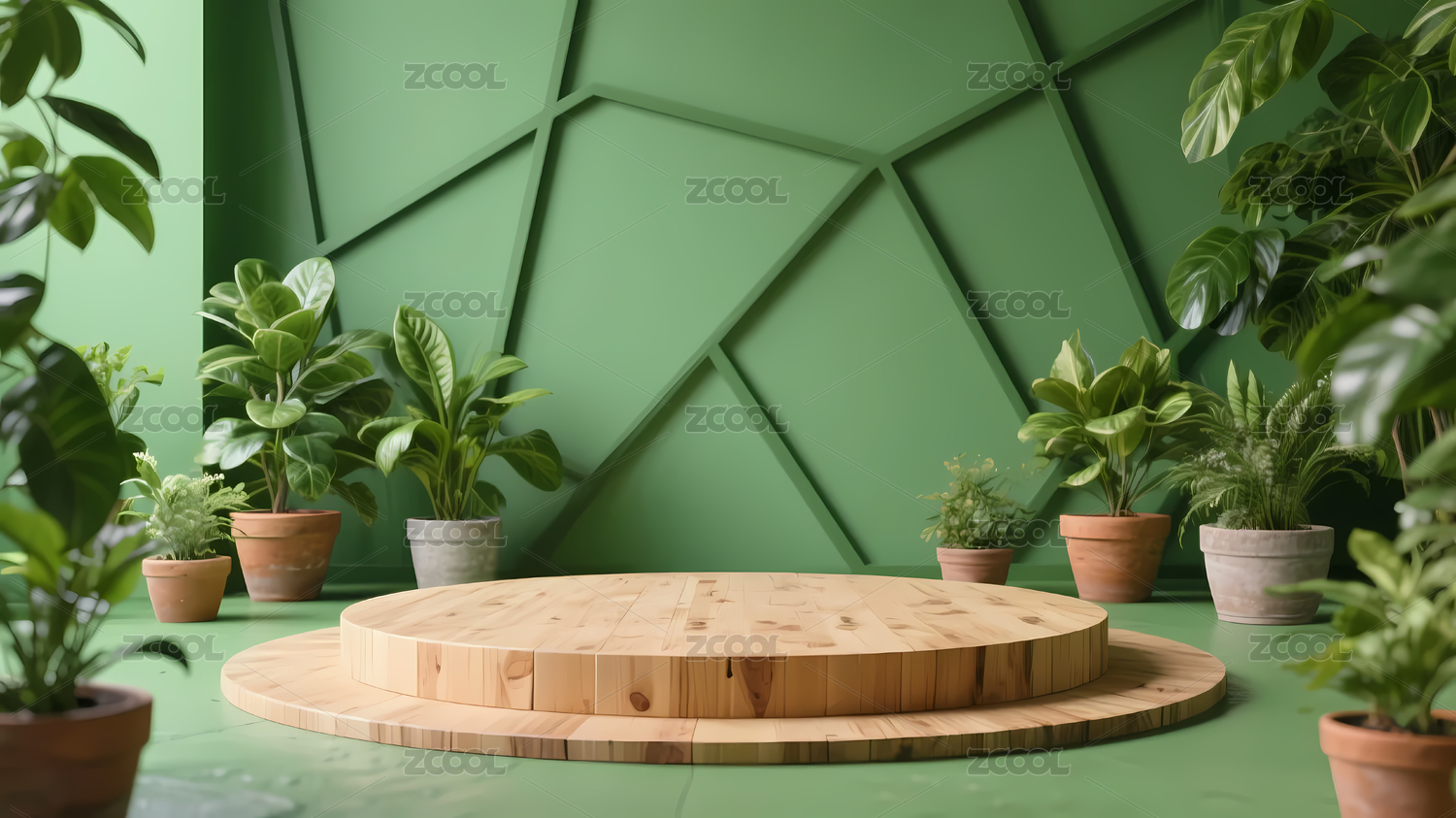 圆形,绿植,托盘,墙壁,几何,清新,自然,木色,绿色,装饰