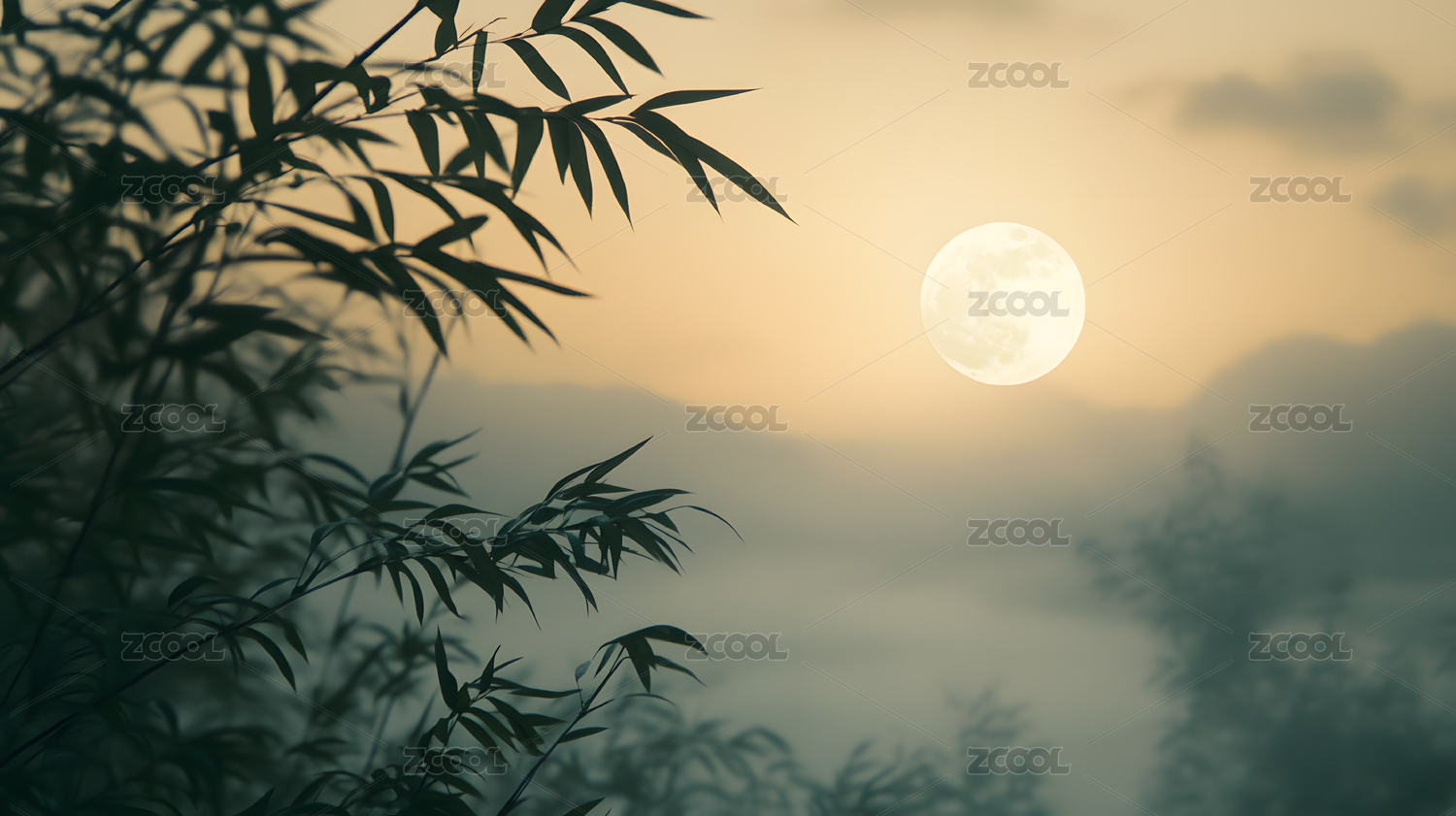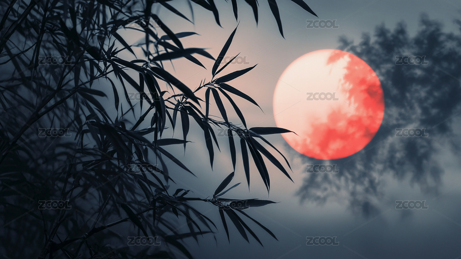 竹枝剪影与明亮圆月