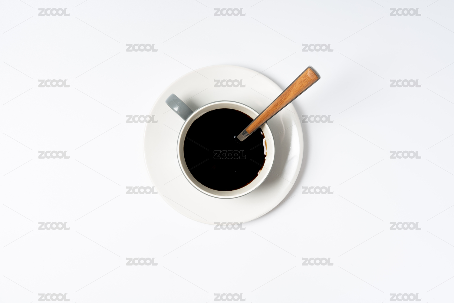 一杯咖啡和咖啡豆摆放在桌面上特写