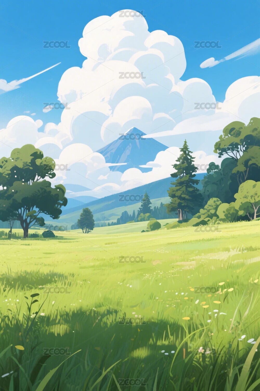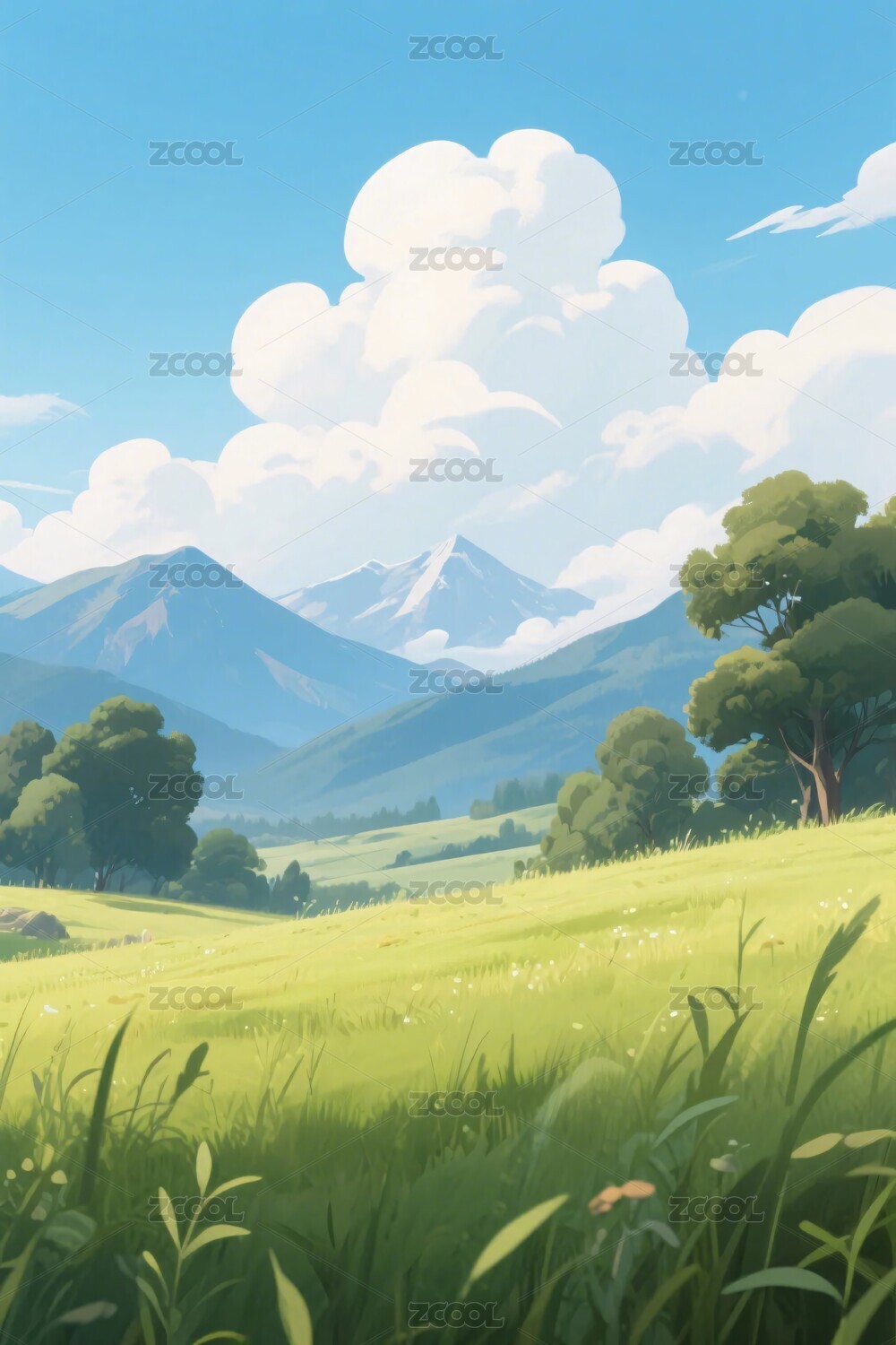 草地,树木,山脉,云朵,蓝天,风景,自然,插画,矢量,模板