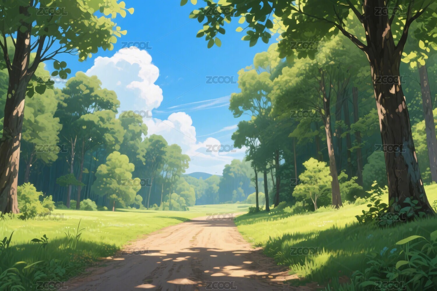 树林,步道,草地,台阶,蓝天,白云,绿植,自然,风景,插画