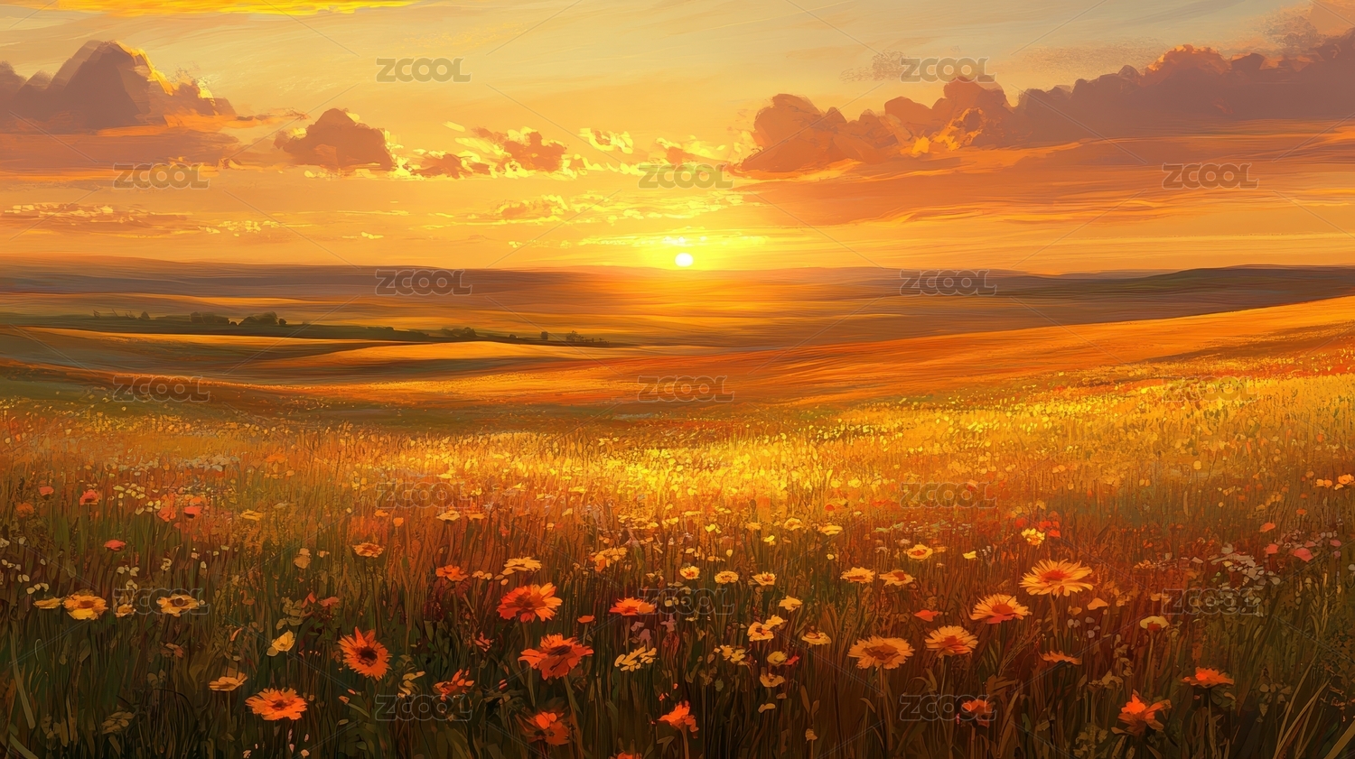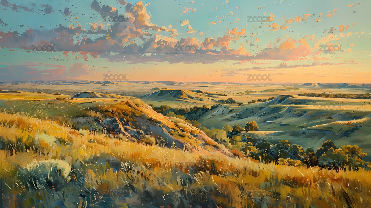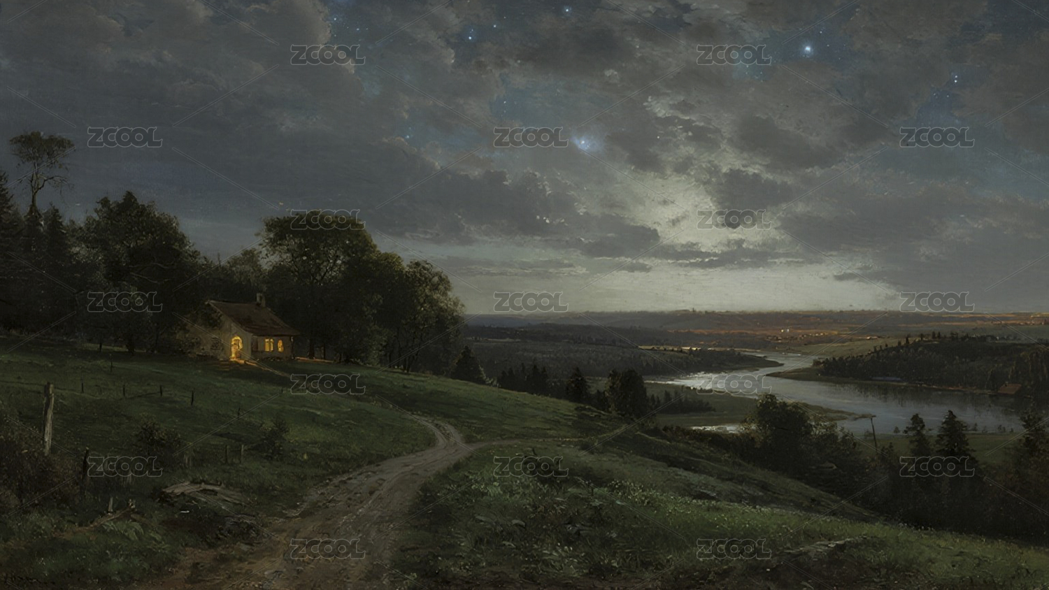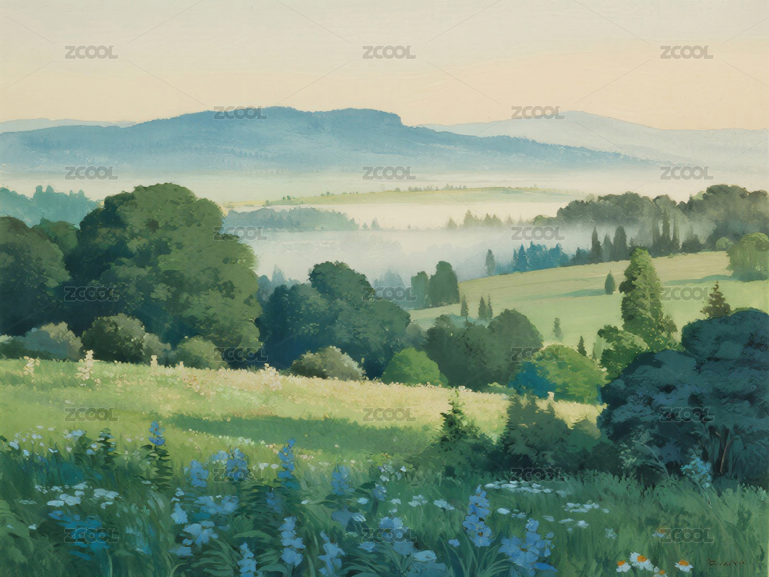 风景,山水,树林,植被,天空,云雾,开阔地,田园,油画,风景画