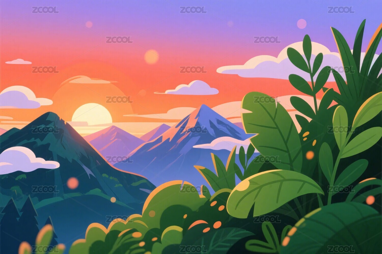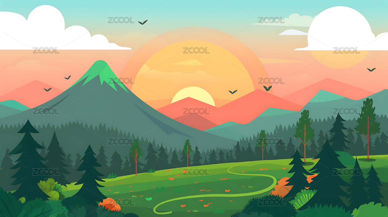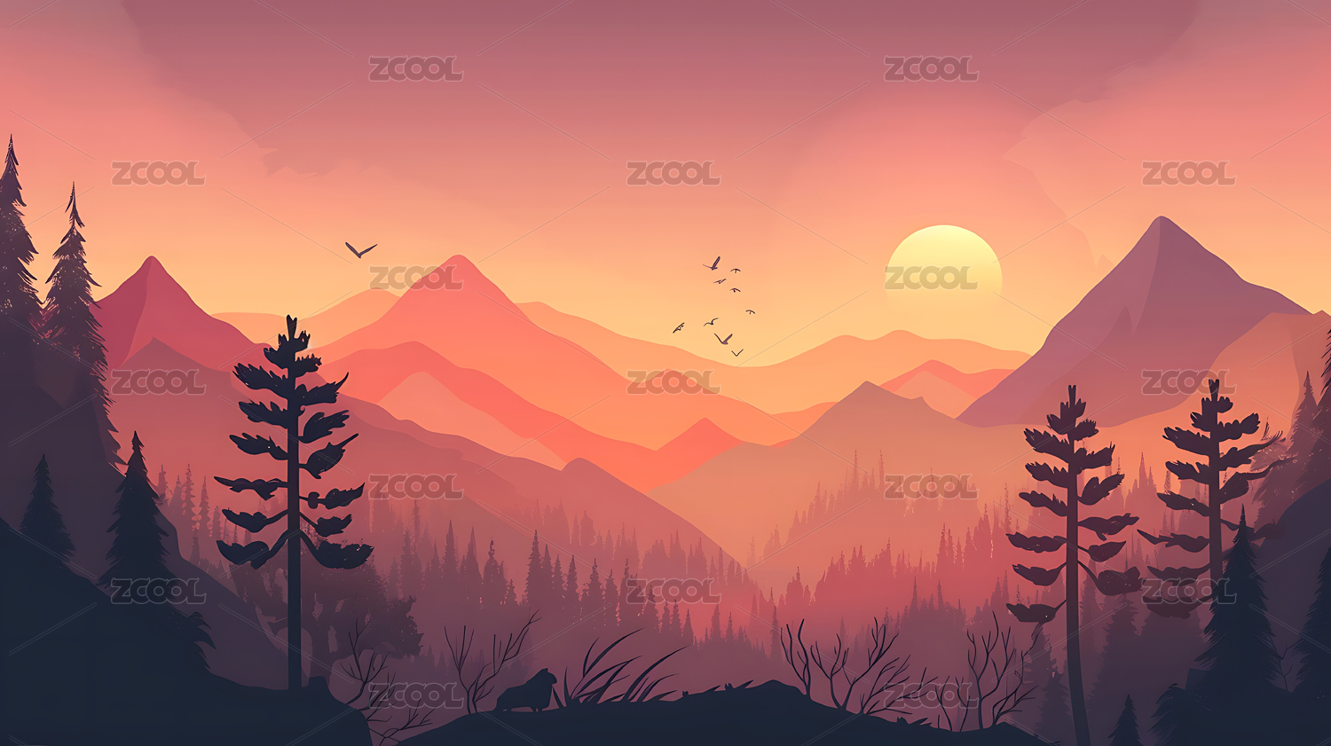 山脉,夕阳,森林,植物,风景,自然,插画,背景,暖色,扁平
