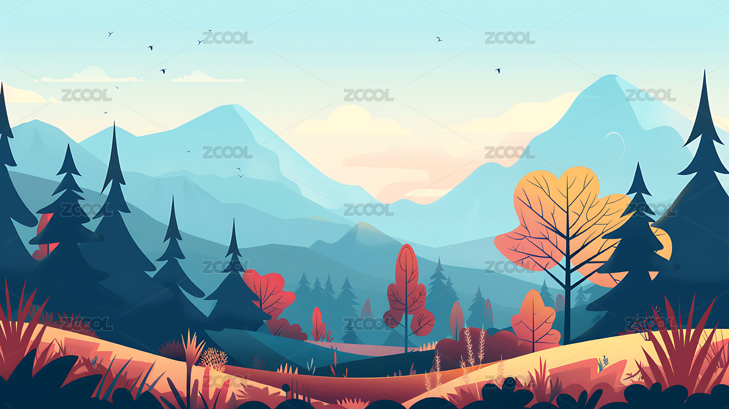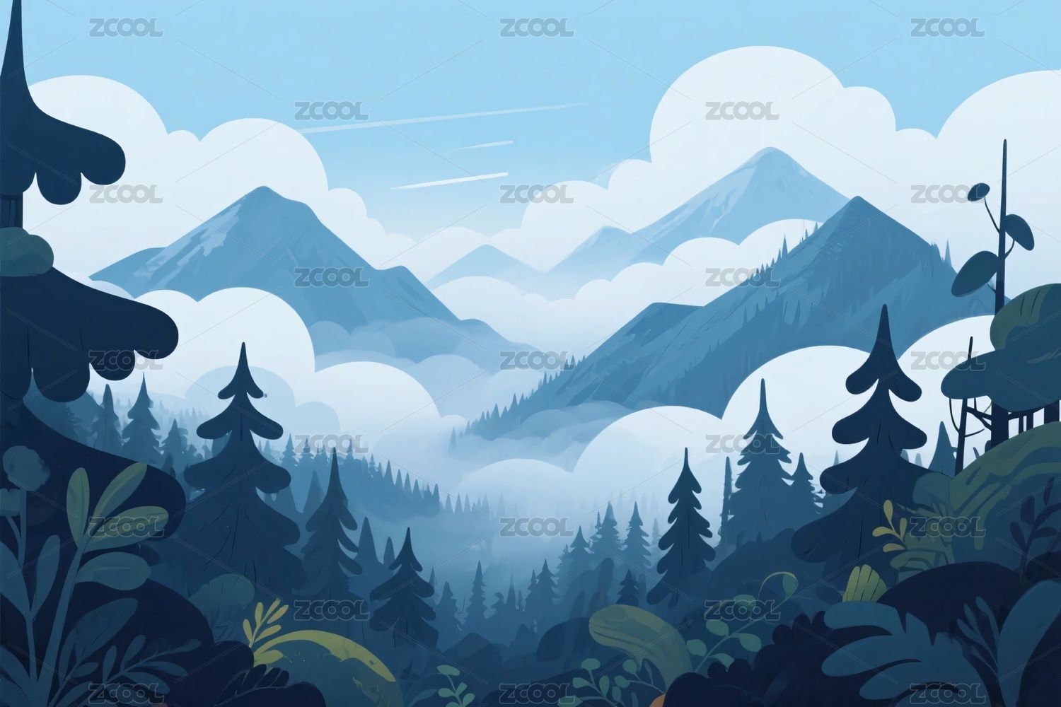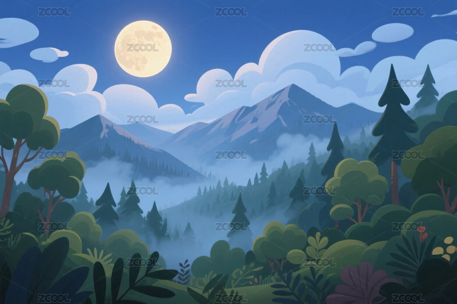 森林,树木,山脉,月亮,山峦,草地,雾气,风景,插画,矢量