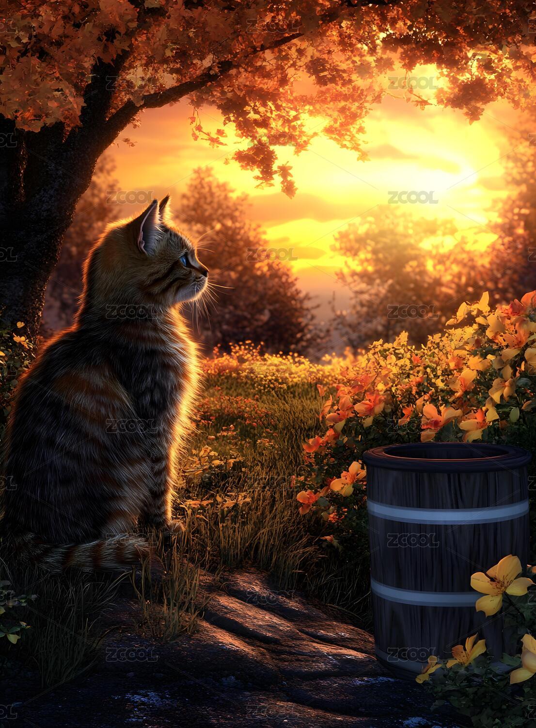 秋日,山丘,独树,橘猫,酣睡,夕阳,余晖,暖光,山坡,草地