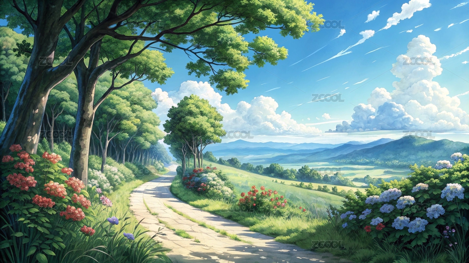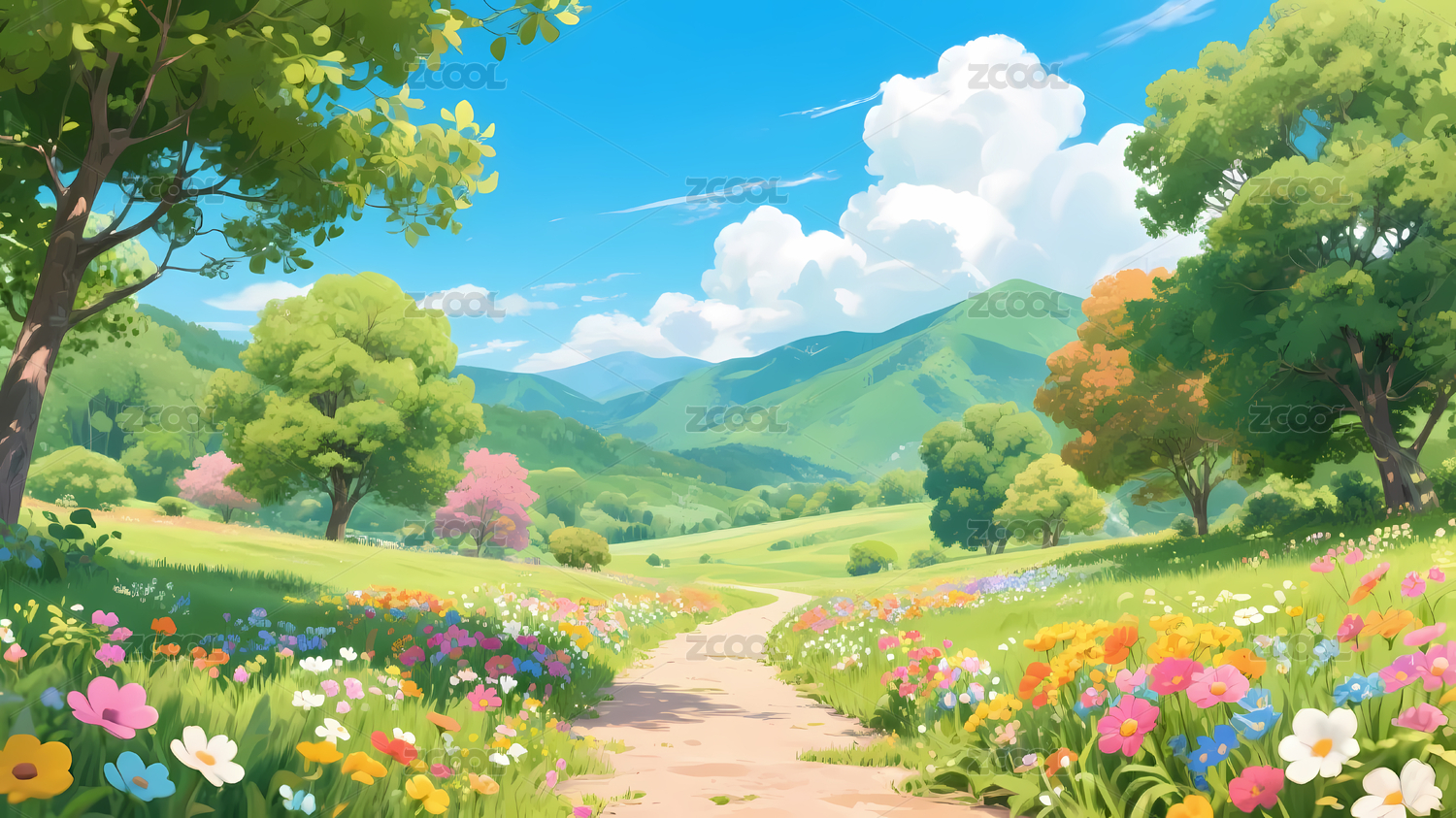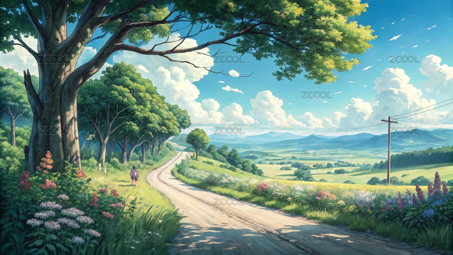 绿树,远山,蓝天白云,花草,野花,乡间小路,田园,树木,花朵,天空