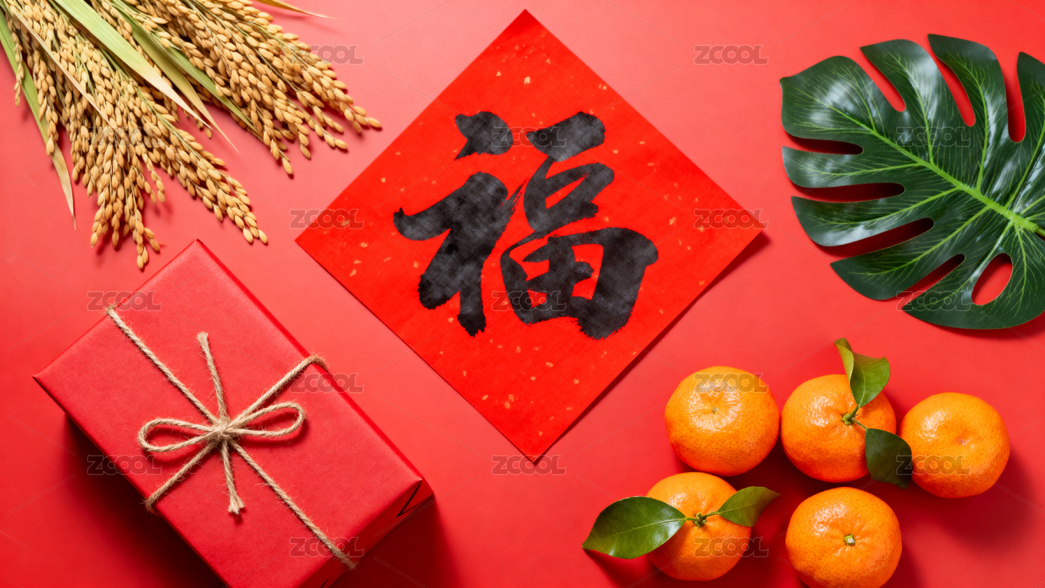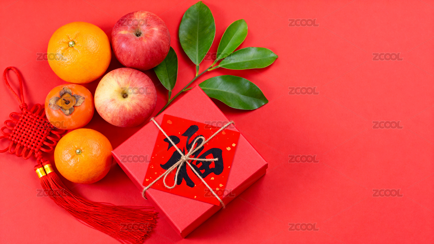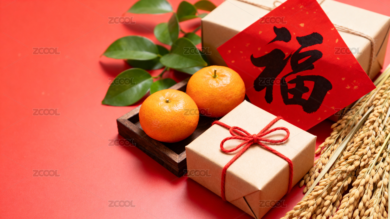 充满中国节日气息的背景下摆放着多个礼品盒及礼品