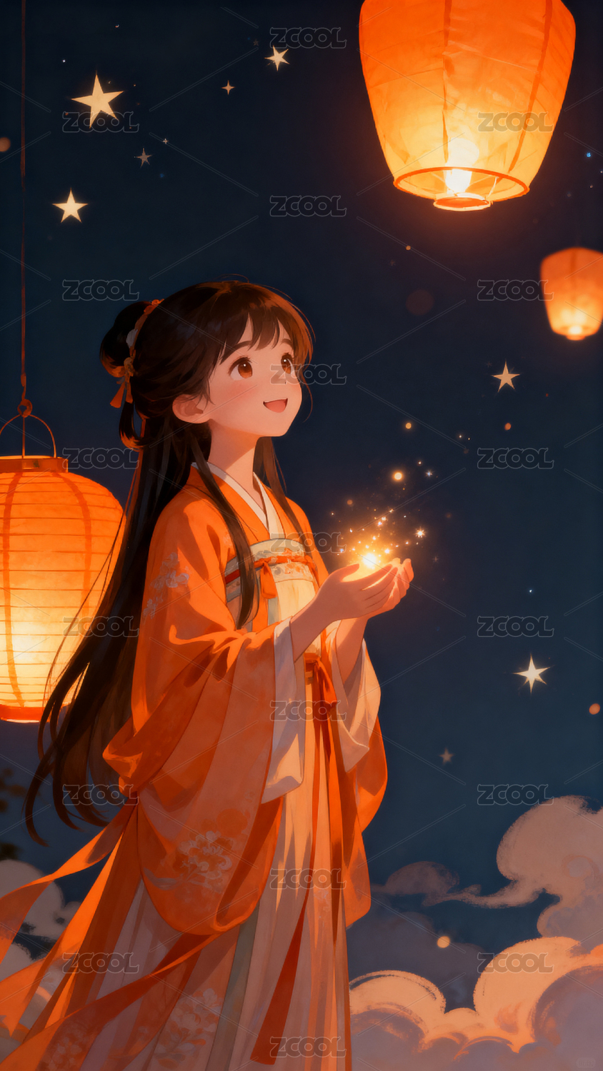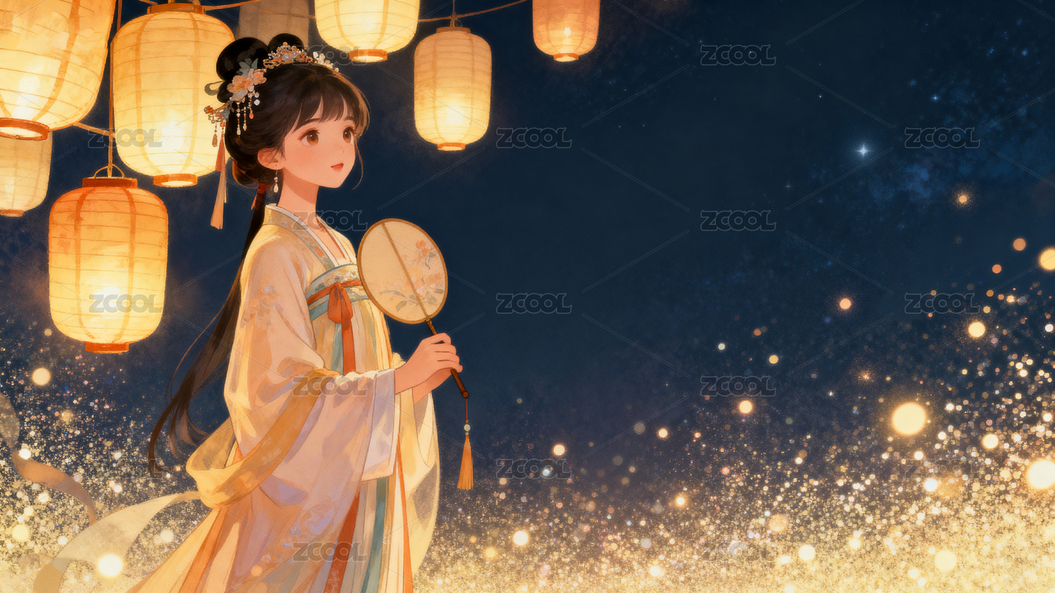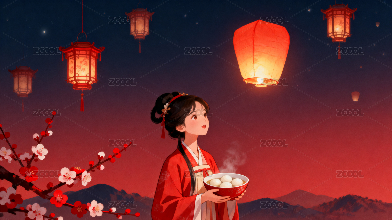 传统,夜晚,灯光,灯笼,装饰,红色,背景,白色,服饰,发饰