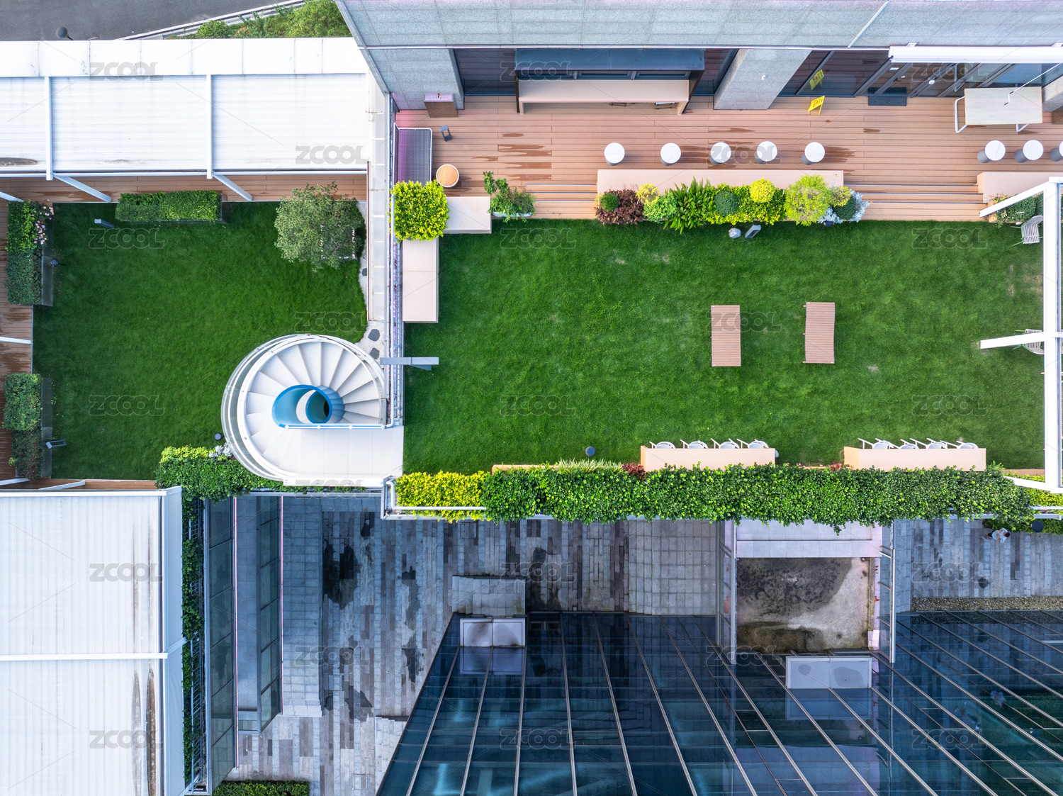 航拍绿色城市,屋顶和建筑周围都种满了绿植