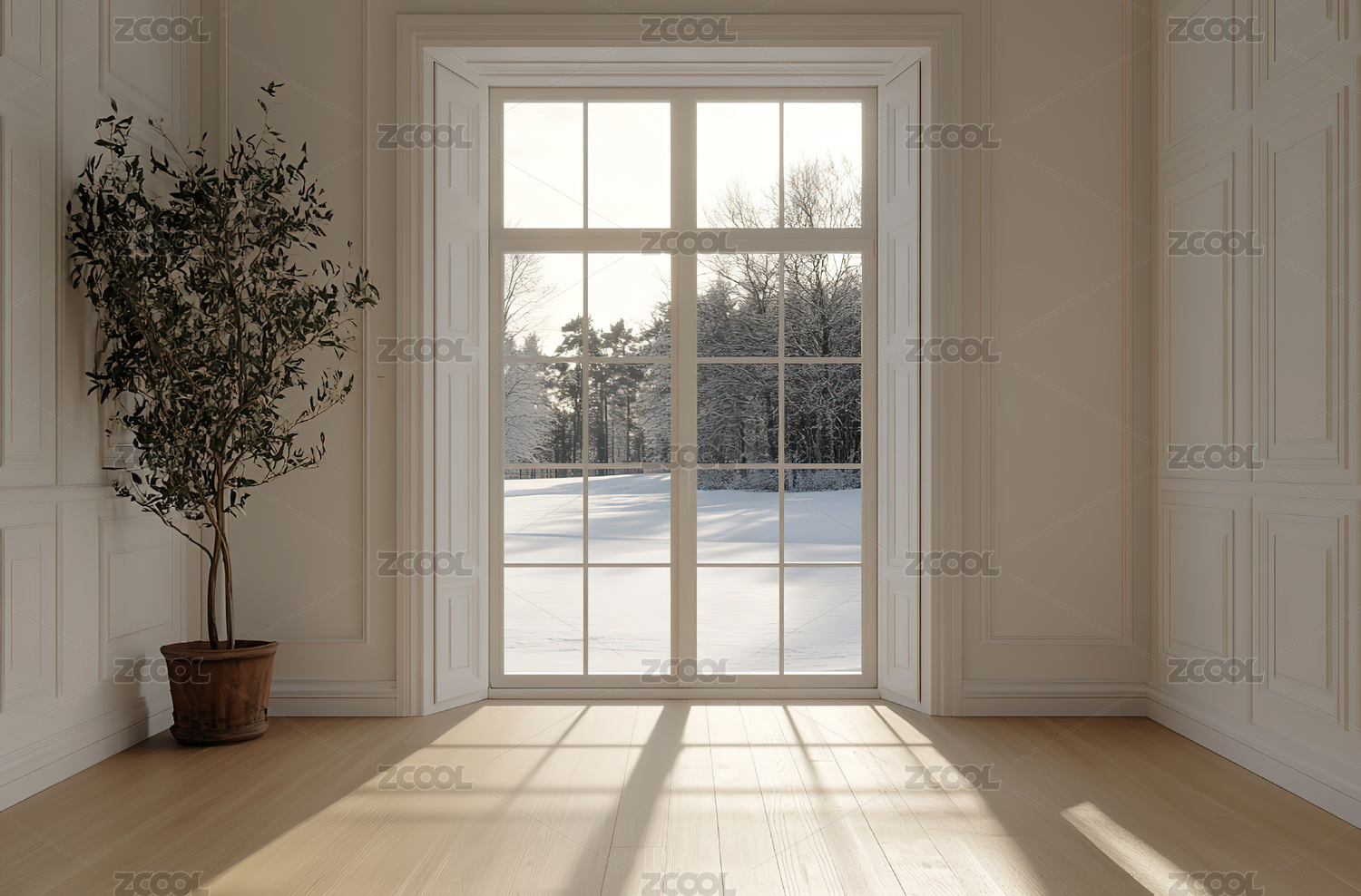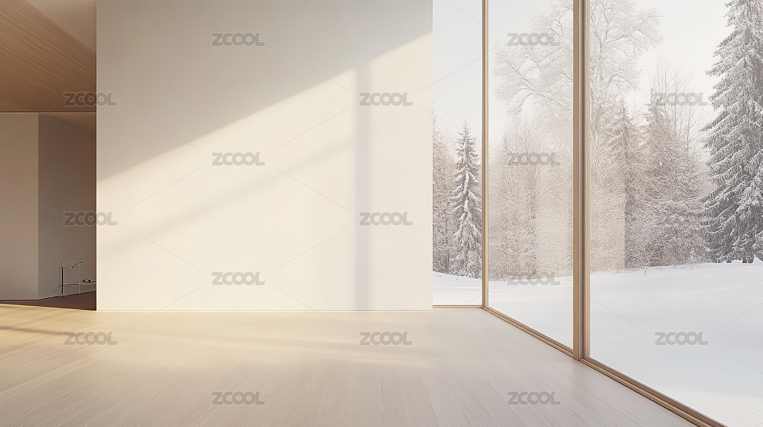 明亮空旷房间冬日雪景
