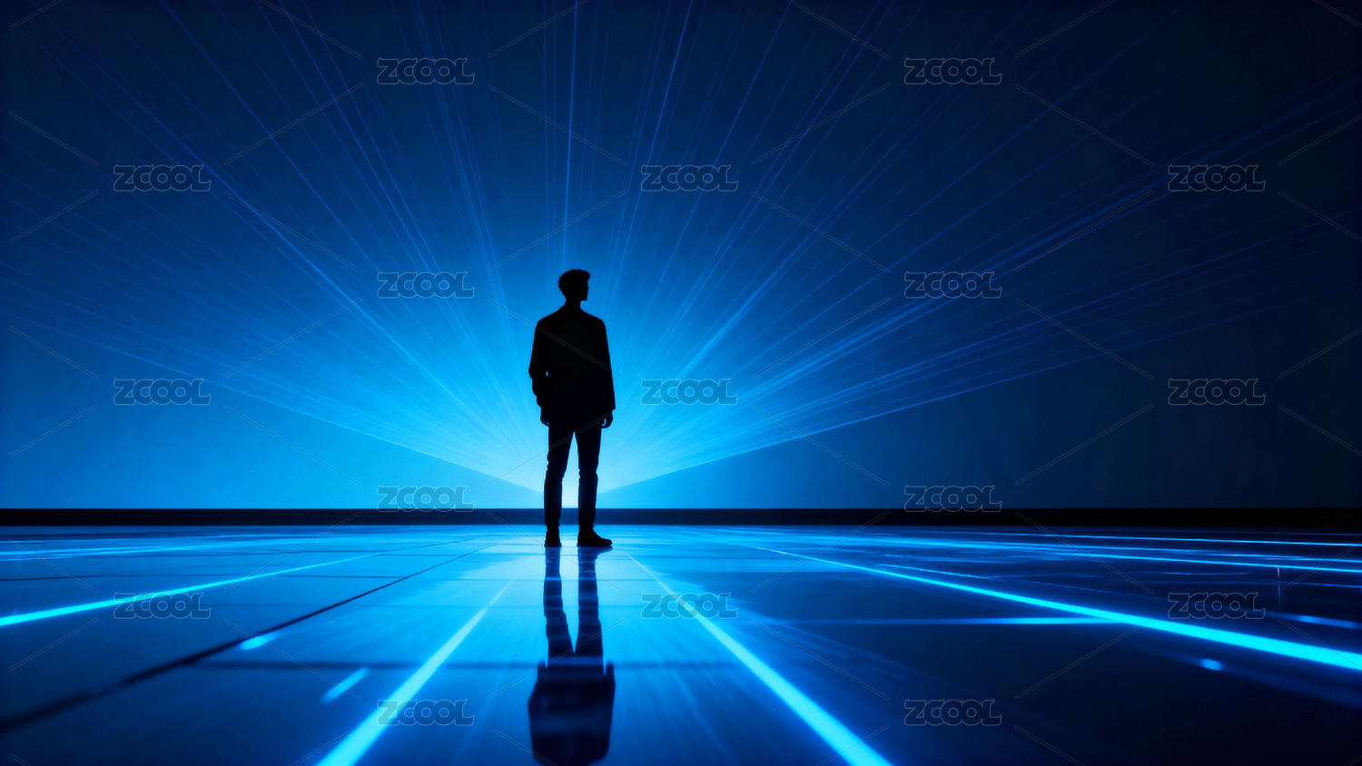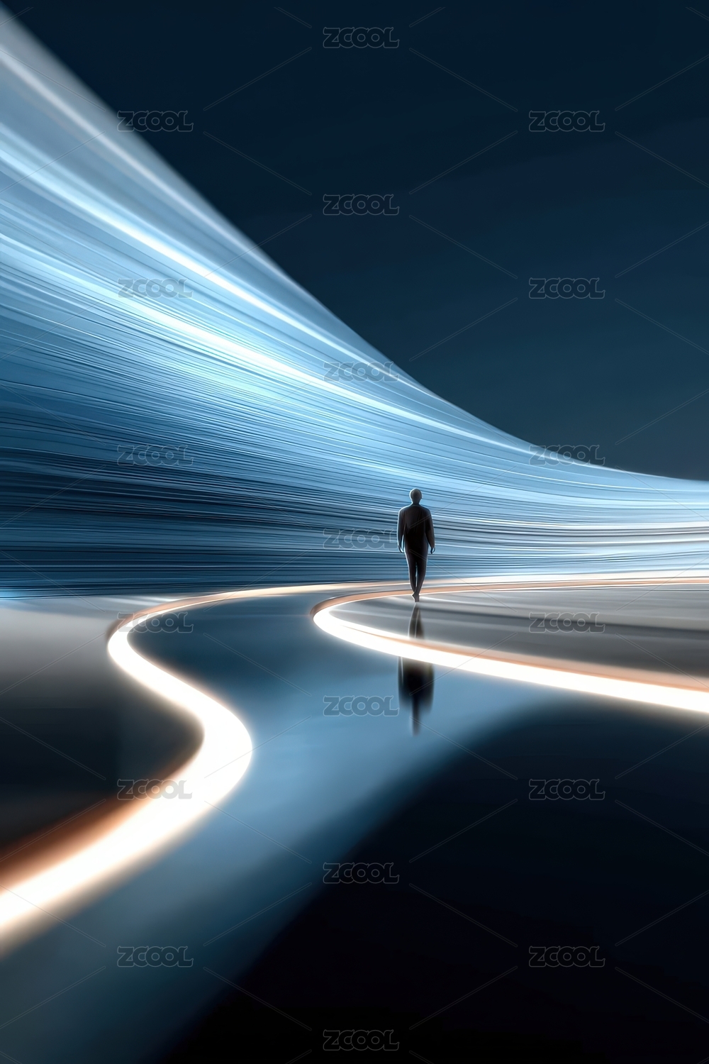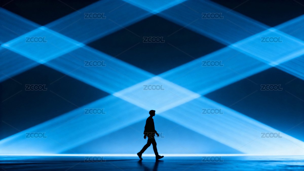 穿西装的剪影人物在蓝白渐变的发光通道行走
