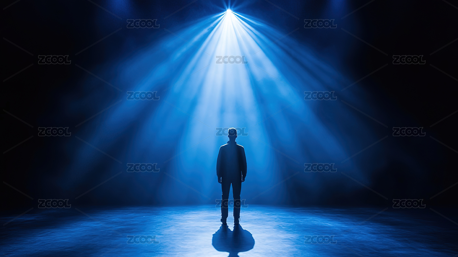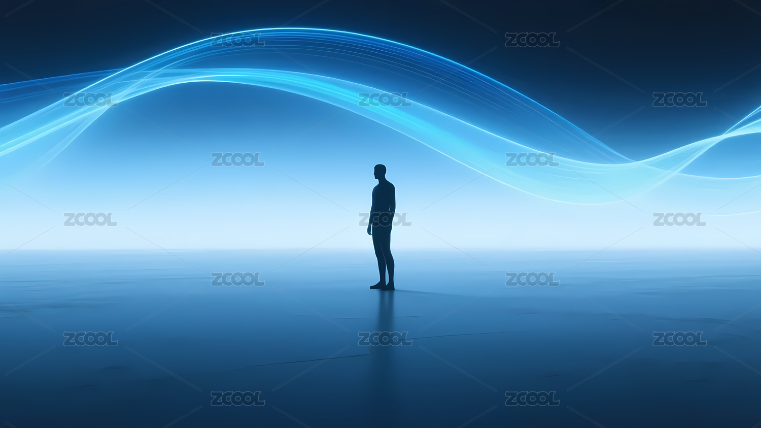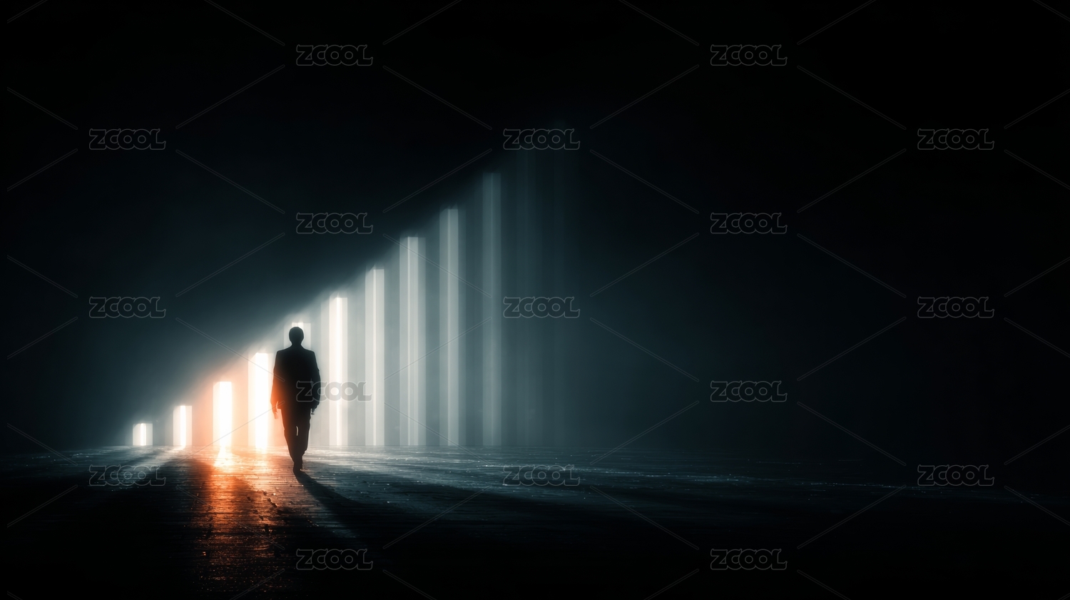 穿西装的剪影人物在蓝白渐变的发光通道行走